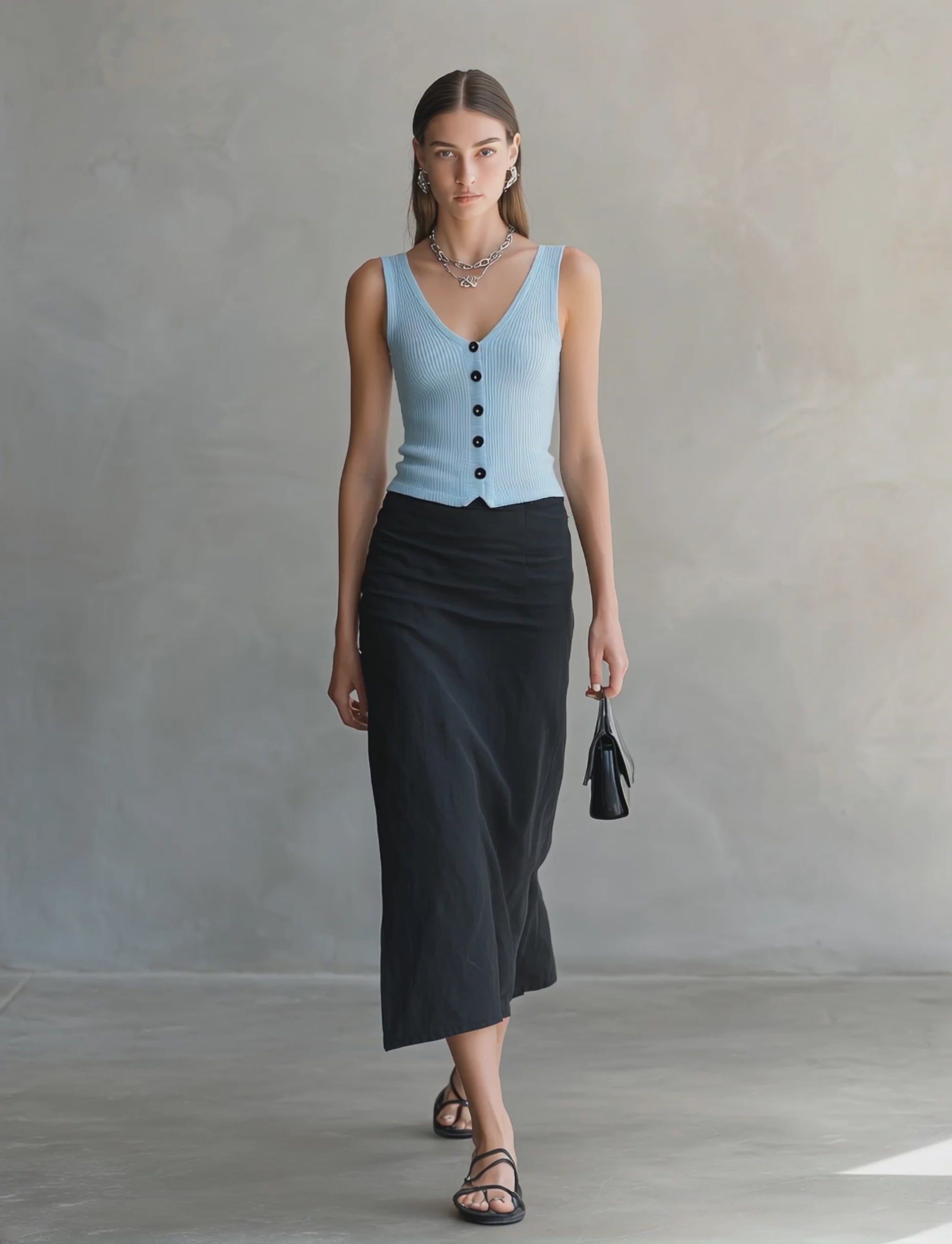 A stylish and comfortable two-piece outfit featuring a light blue lightweight knit vest paired with a black woven skirt. The soft knit top offers a cozy yet breathable feel, while the flowing skirt adds a touch of effortless elegance, creating a balanced and versatile look.