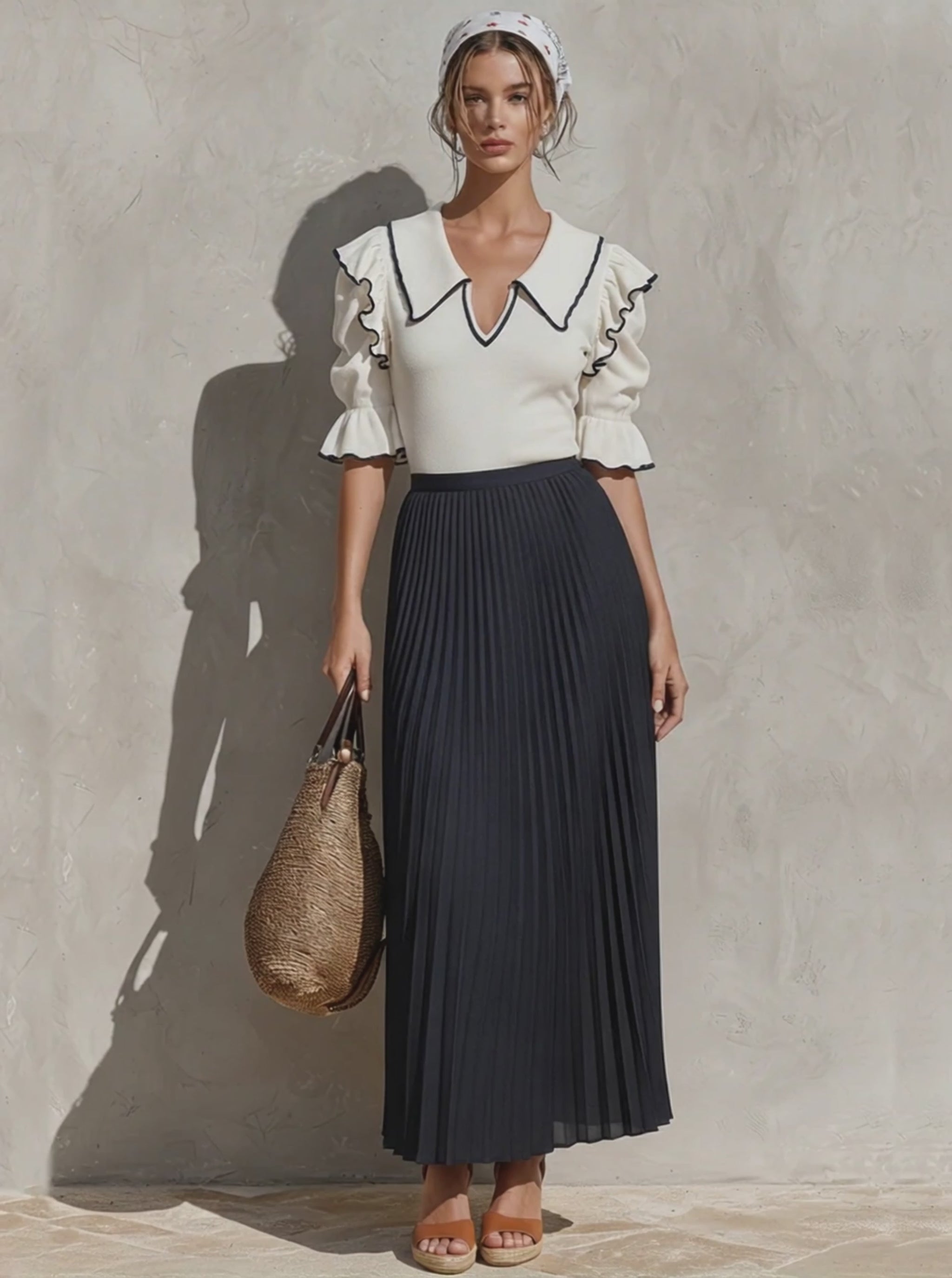 Effortlessly chic two-piece set with a crisp knit top and a flowing pleated maxi skirt, finished with a charming ruffle collar for a clean resort-ready look.