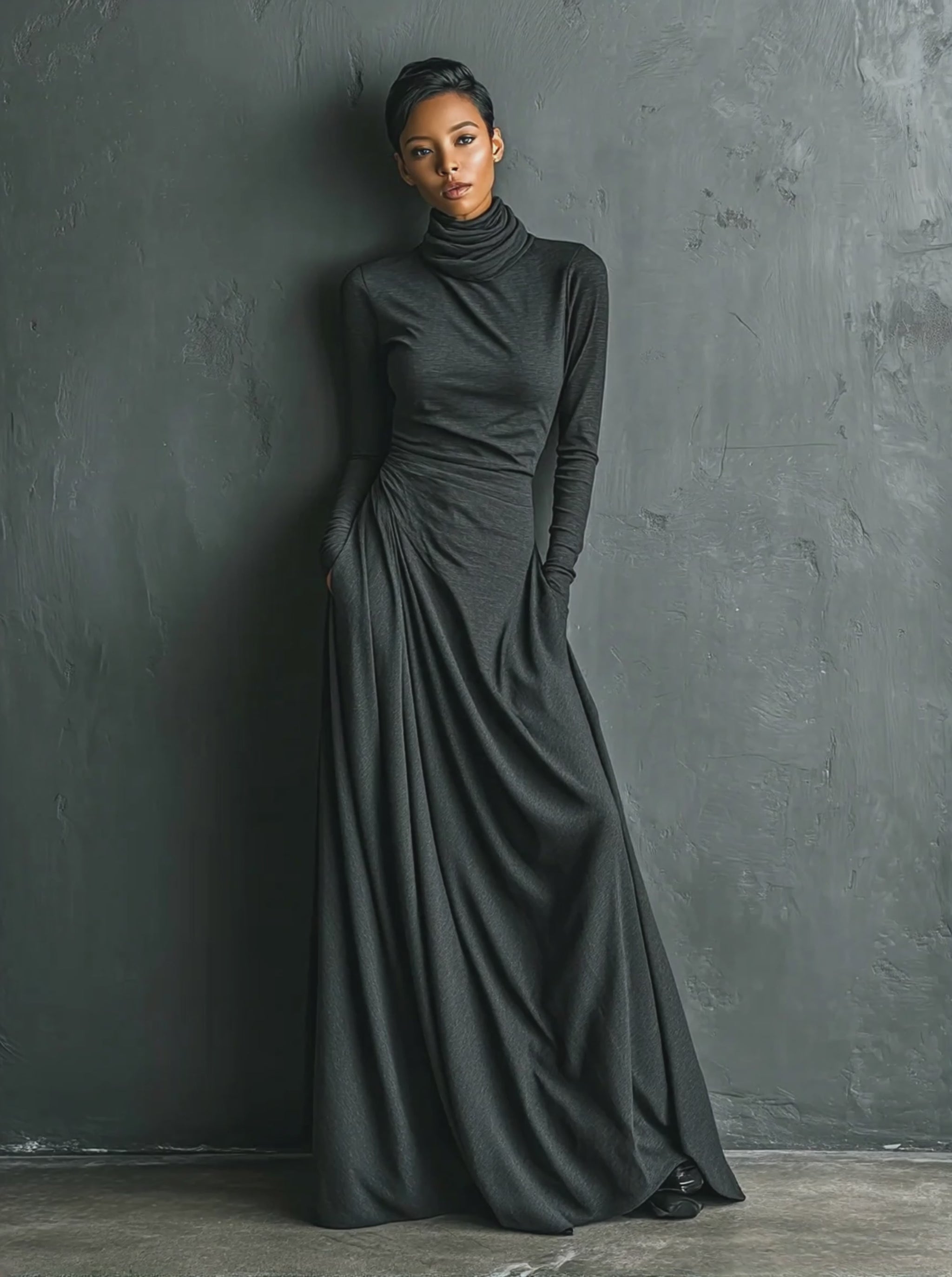 A charcoal Stretch Polyester-Cotton Blend maxi dress with a flattering turtleneck and dramatic draped detailing. It’s sleek, comfortable, and perfect for chic casual or formal events.