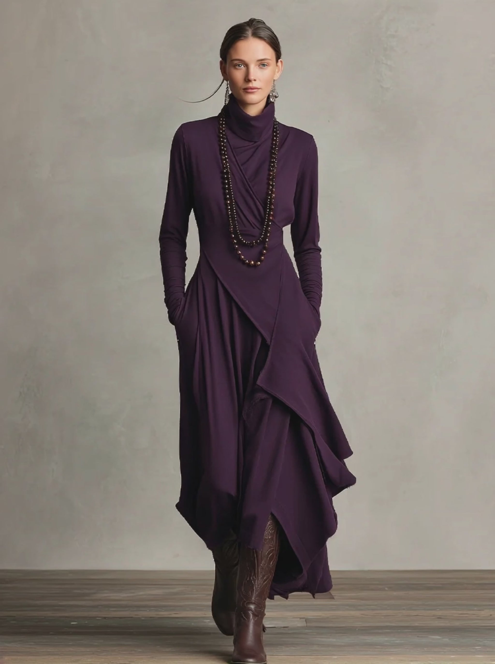A purple Cotton maxi dress with a turtleneck and draped, asymmetric detailing. It’s relaxed, bohemian, and perfect for casual to semi-formal events.