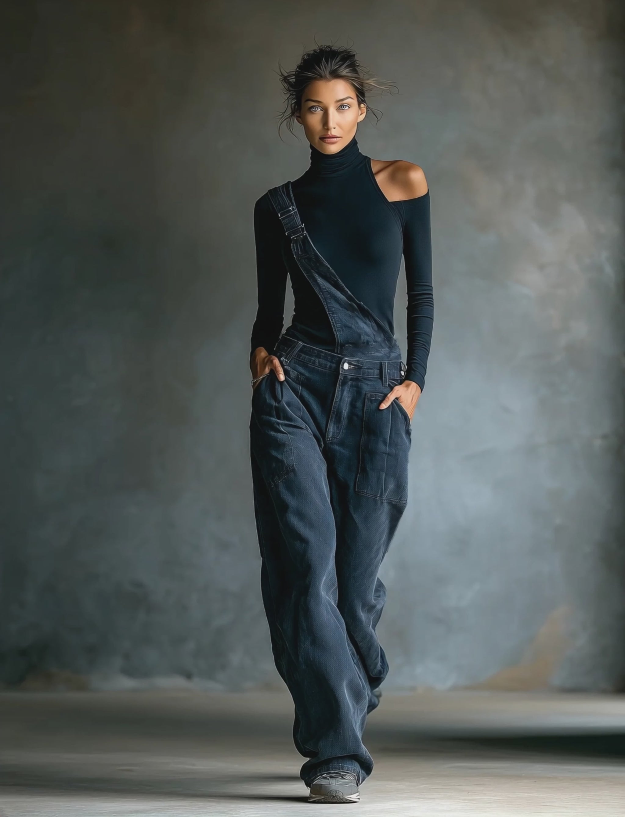 A bold black one-shoulder turtleneck paired with relaxed blue-gray denim overalls for a modern, edgy look.