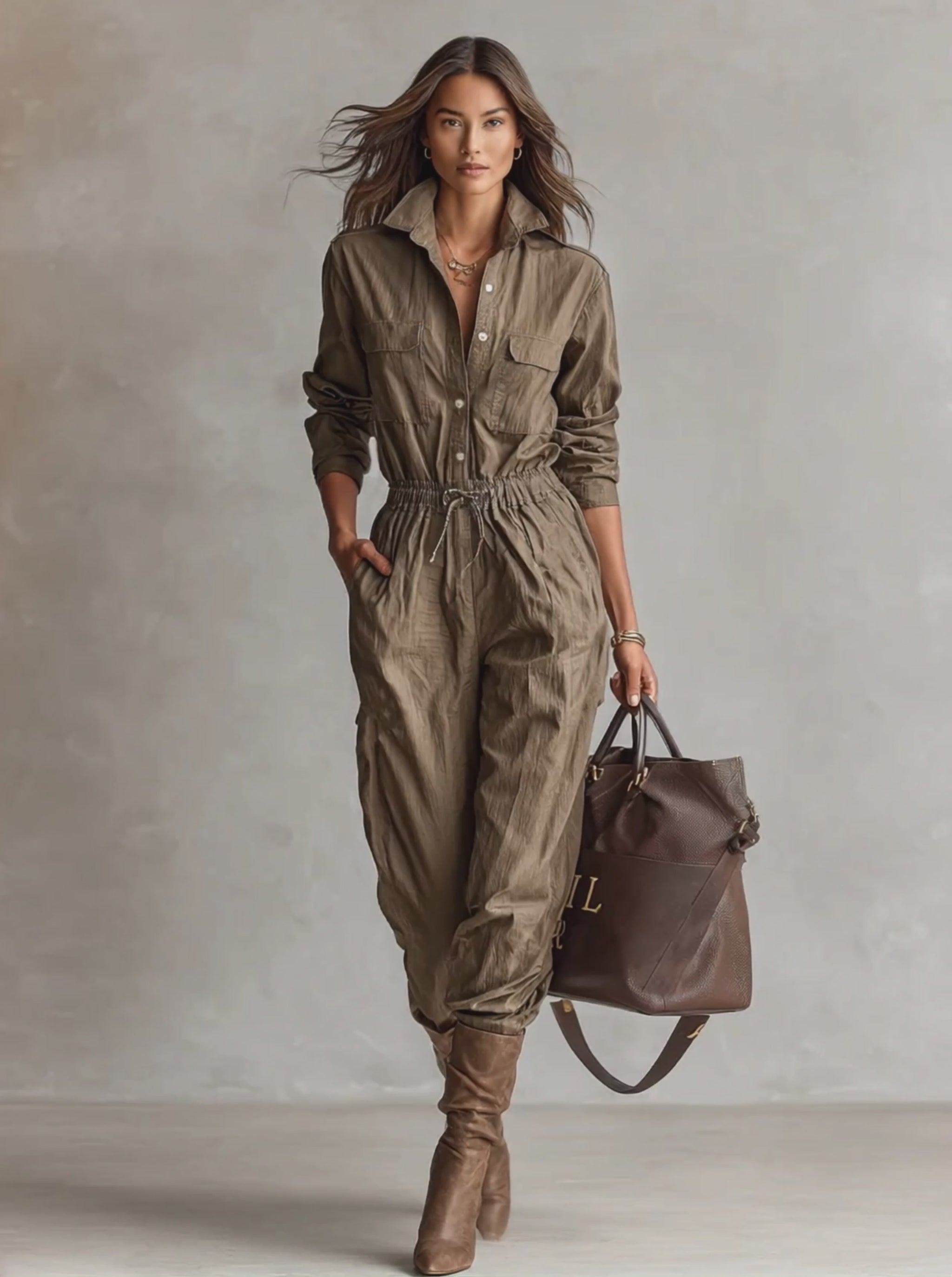Step into effortless style with this casual jumpsuit featuring a classic shirt collar and adjustable drawstring waist. Designed for comfort and versatility, it's ideal for both relaxed days and on-the-go adventures.