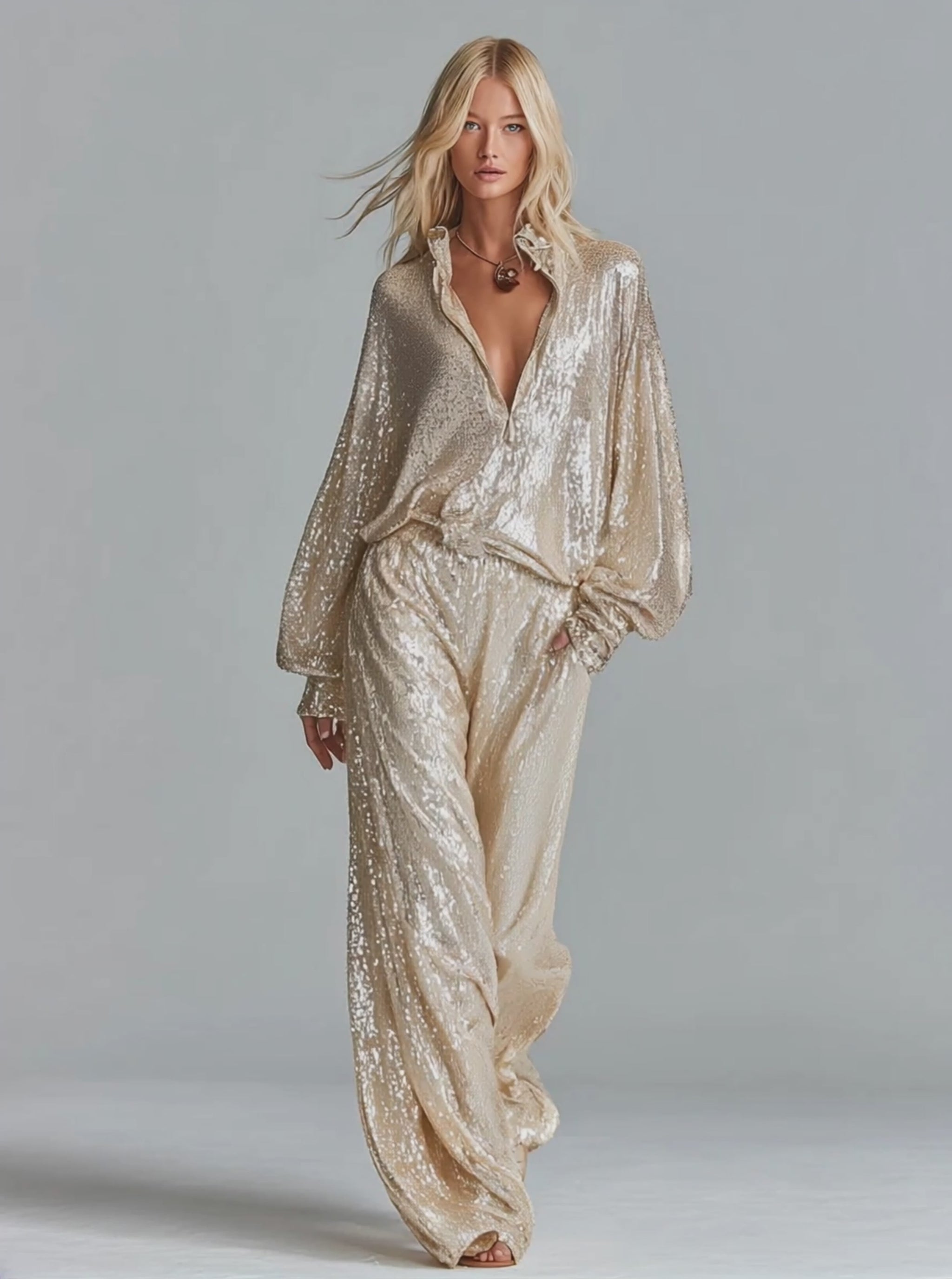 A sparkling gold sequin lounge set with a collared top and wide-leg pants. It offers a glamorous look perfect for parties and stylish lounging at home.