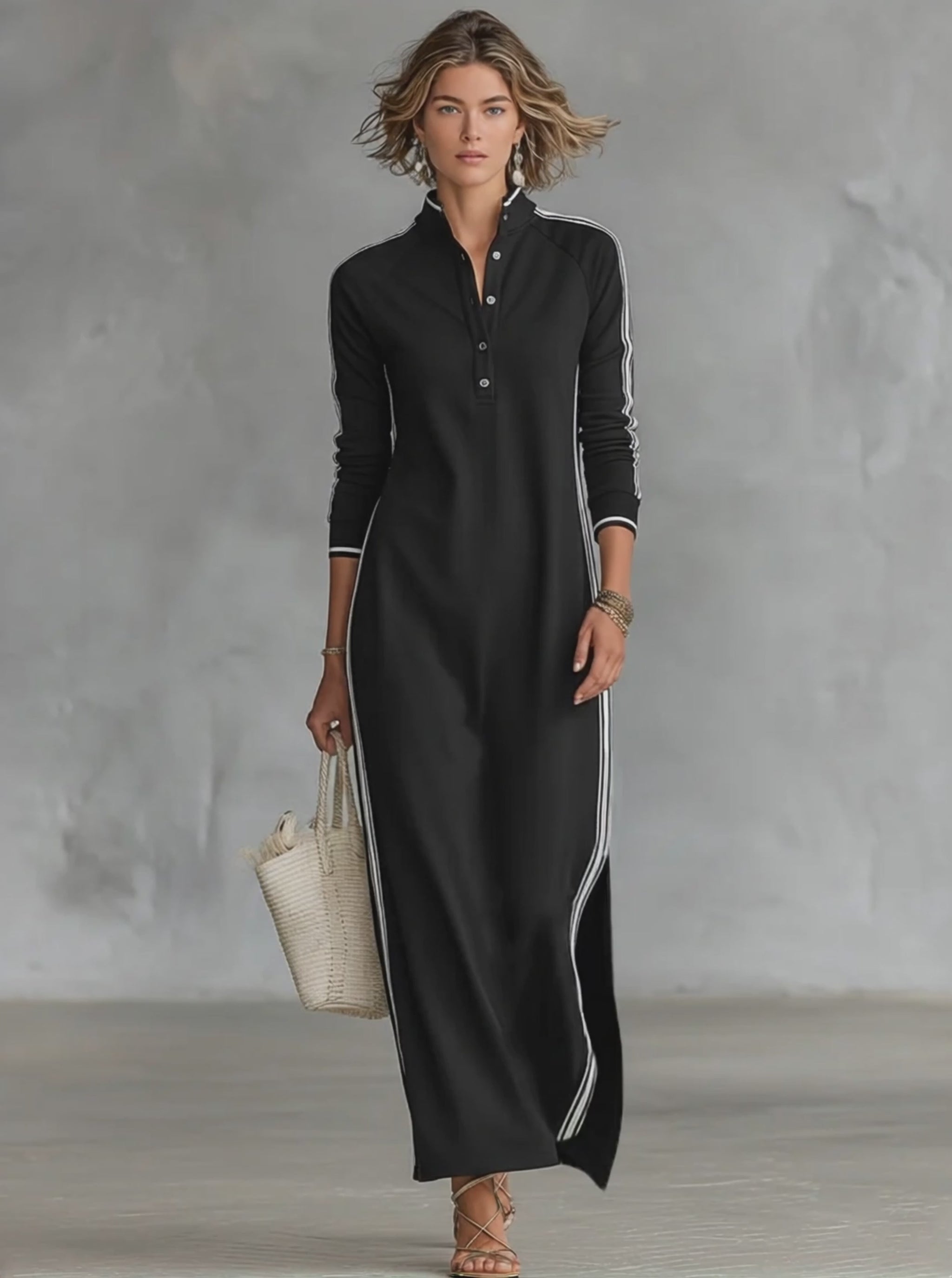 A clean sweatshirt-style maxi dress featuring a button-down collar and white trim accents for a refined, minimalist silhouette.