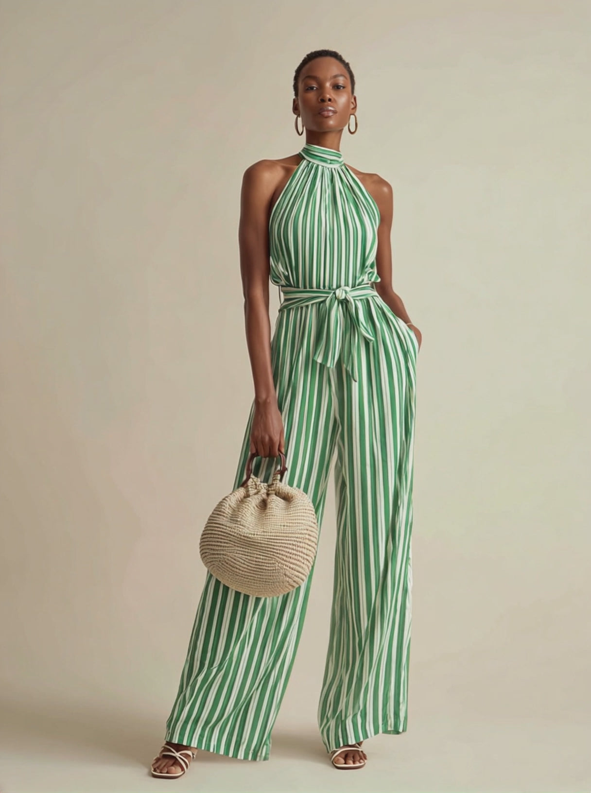 This casual and chic green and white stripe jumpsuit, crafted from breathable cotton linen fabric, features a stylish halter neckline and a flattering wide-leg silhouette. The adjustable self-tie belt cinches the waist, creating an elegant and comfortable look. Perfect for summer days, resort wear, or a stylish casual outing.