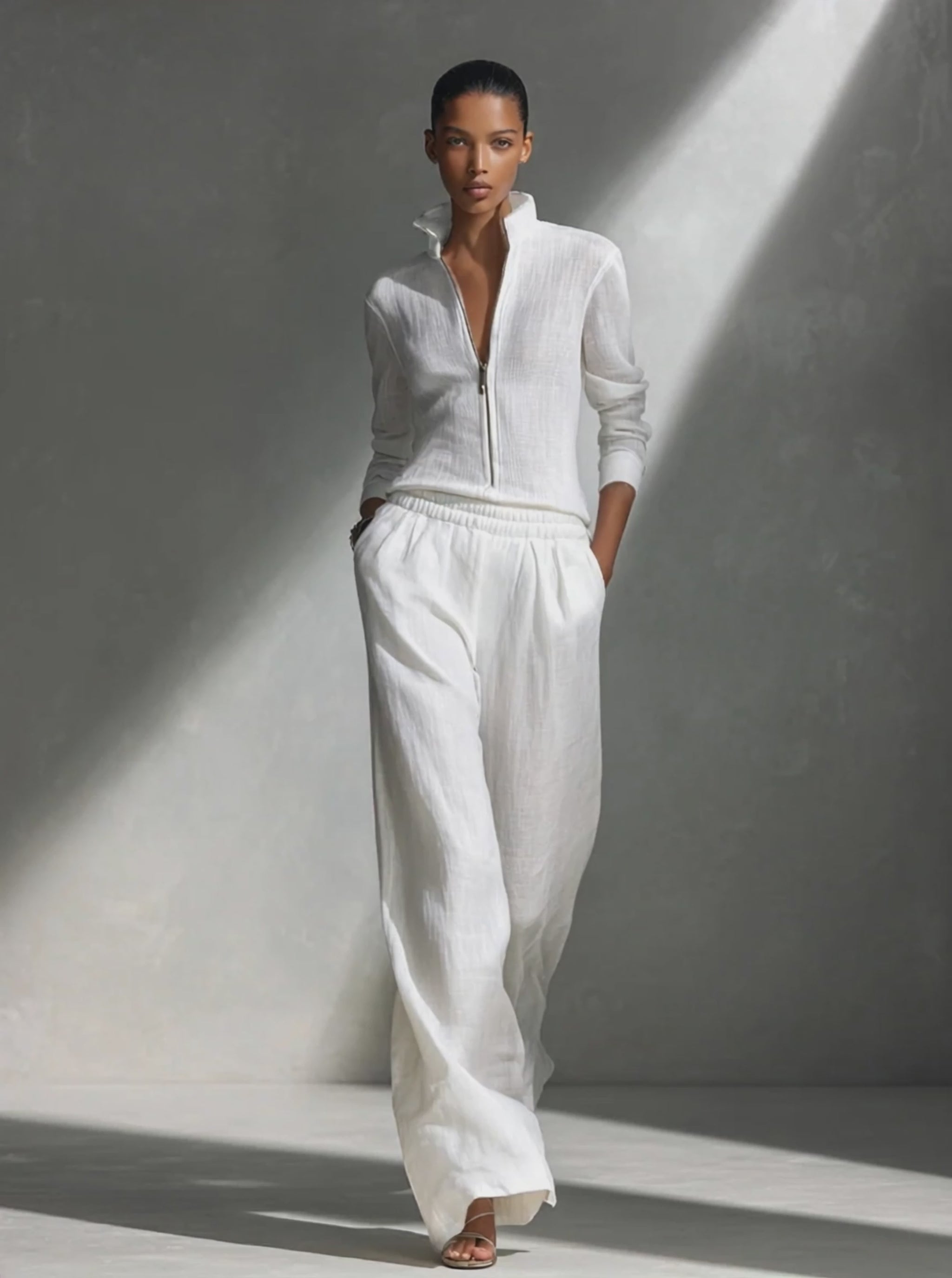 A coordinated white linen set featuring a lightweight zip-up top and matching wide-leg pants. The outfit delivers an airy, relaxed, and refined look ideal for warm weather and effortless everyday style.