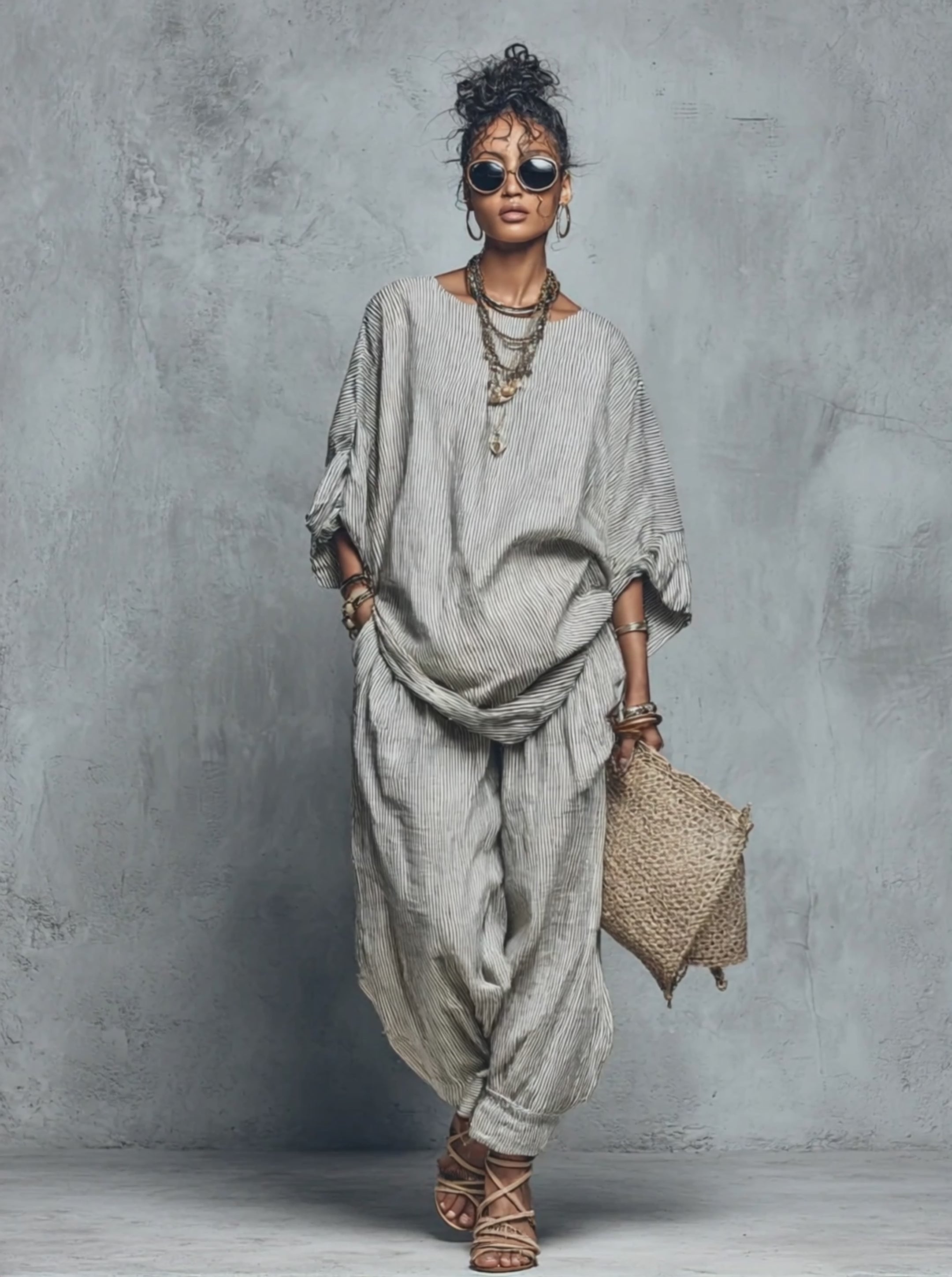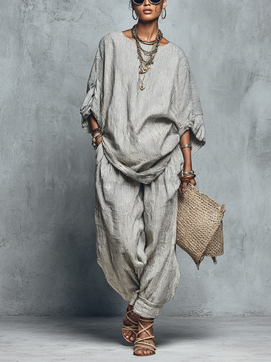 Women's Boho Striped Linen Blend Oversized Top And Harem Pants Set MDZ2761B2BA