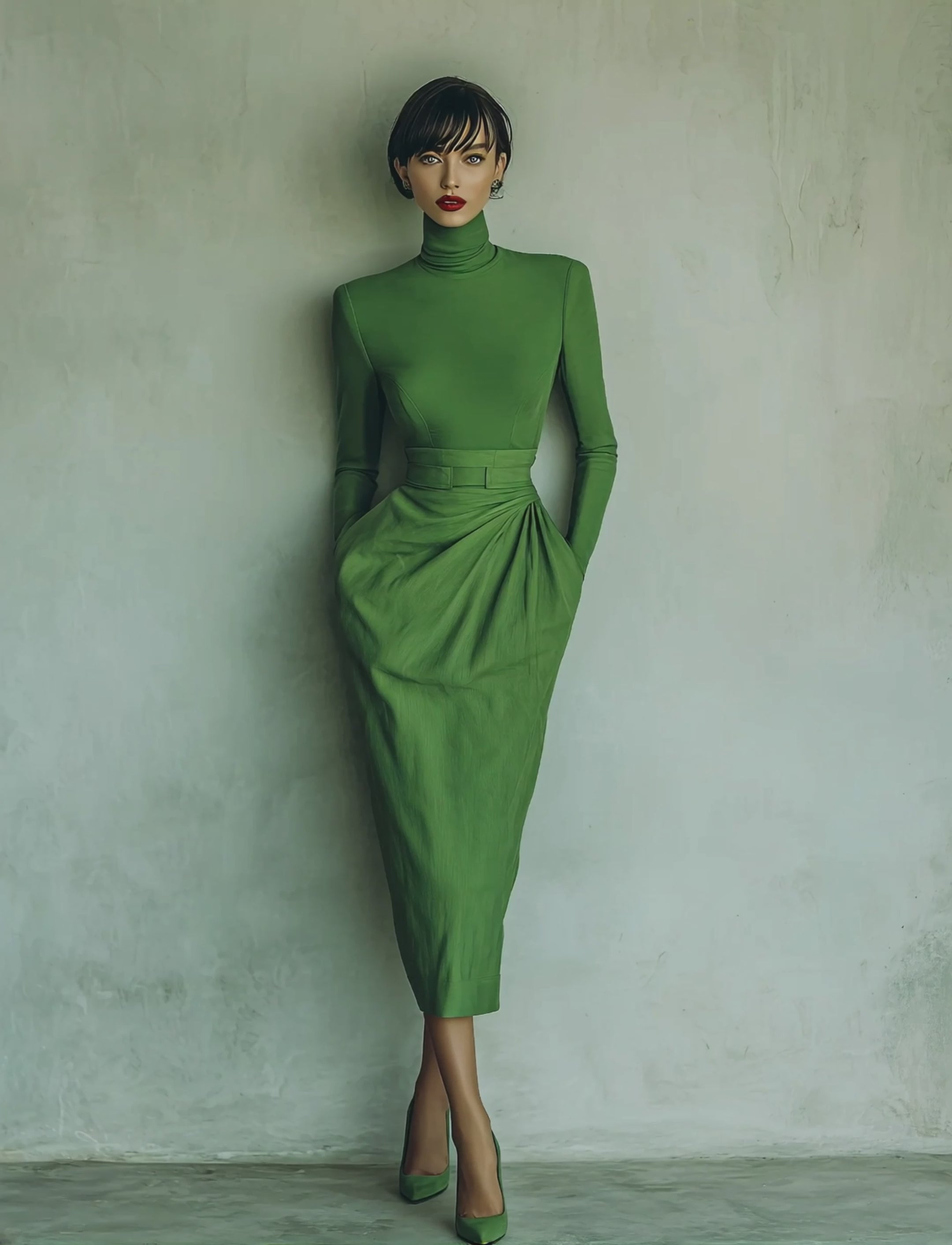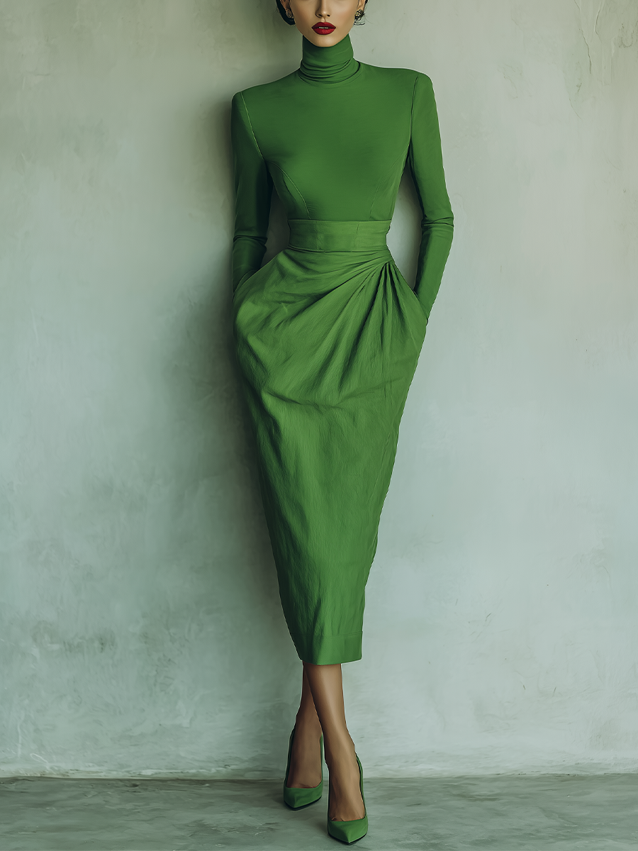 Women's Emerald Green High-stretch Knit Fabric Turtleneck Fitted Top & Ruched Midi Skirt Set MDA1237L0T
