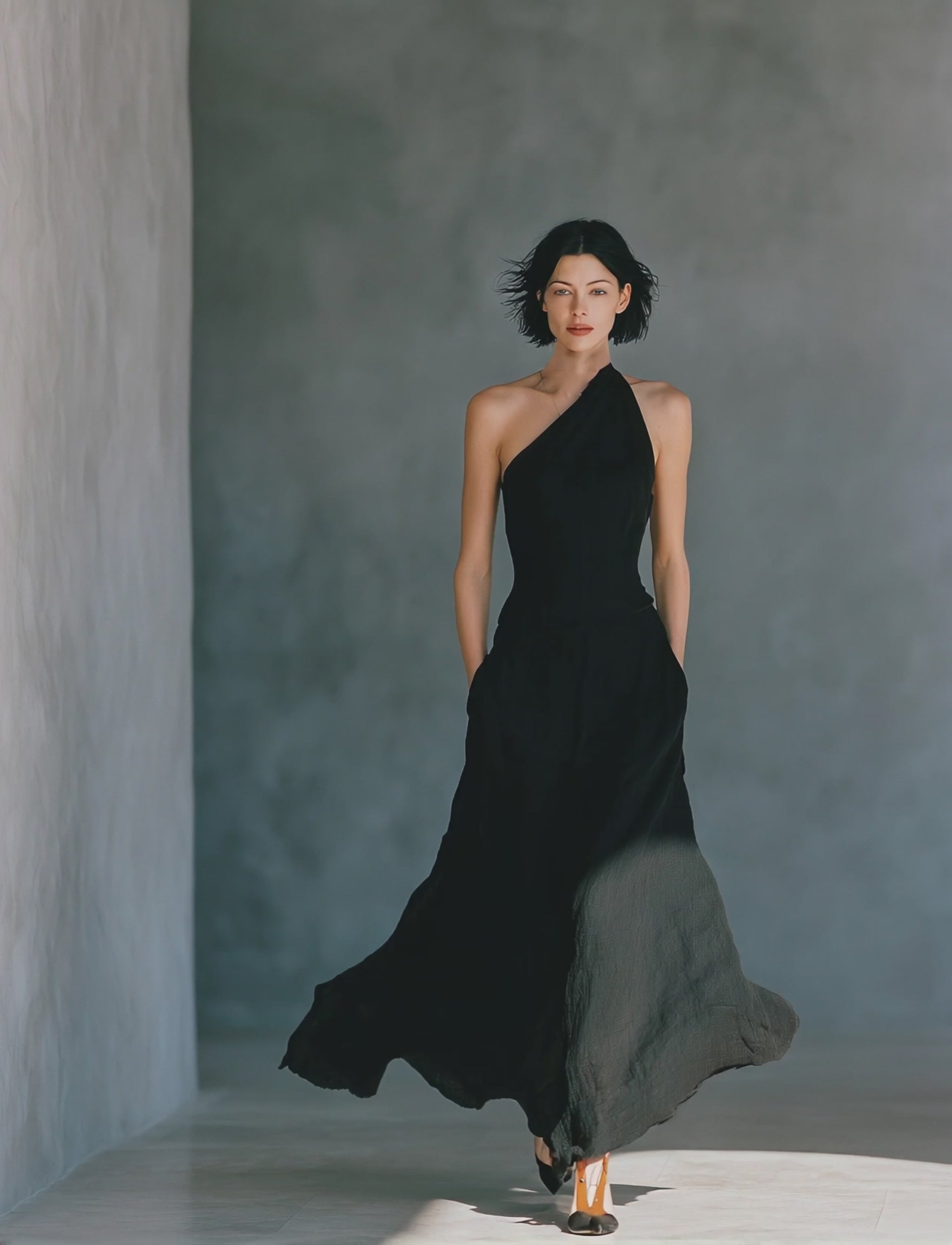 A sleek black one-shoulder maxi dress featuring a fitted bodice and a flowing skirt for a sophisticated, modern look.