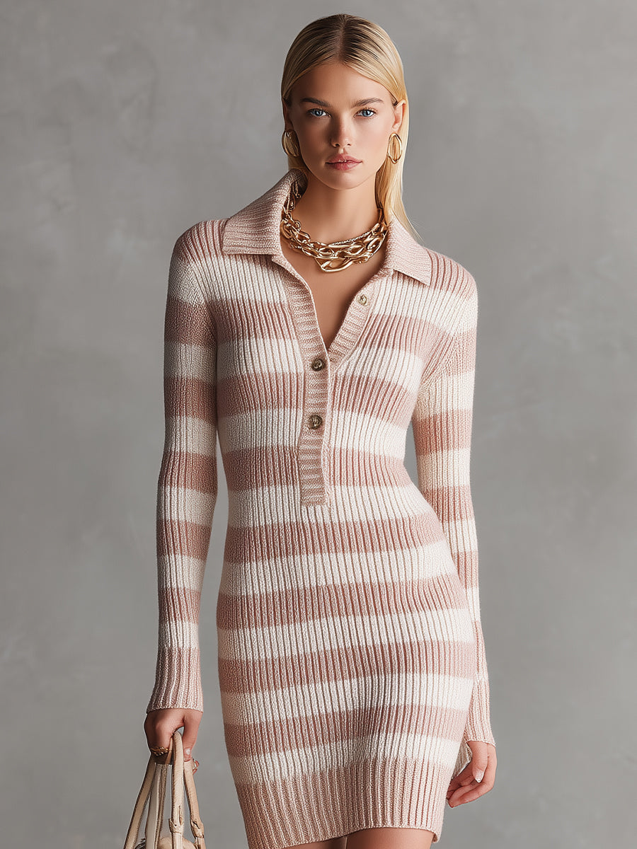 Women's Beige & Pink Striped Knit Chic Polo-Collar Buttoned Mini Dress MDA0190K7I