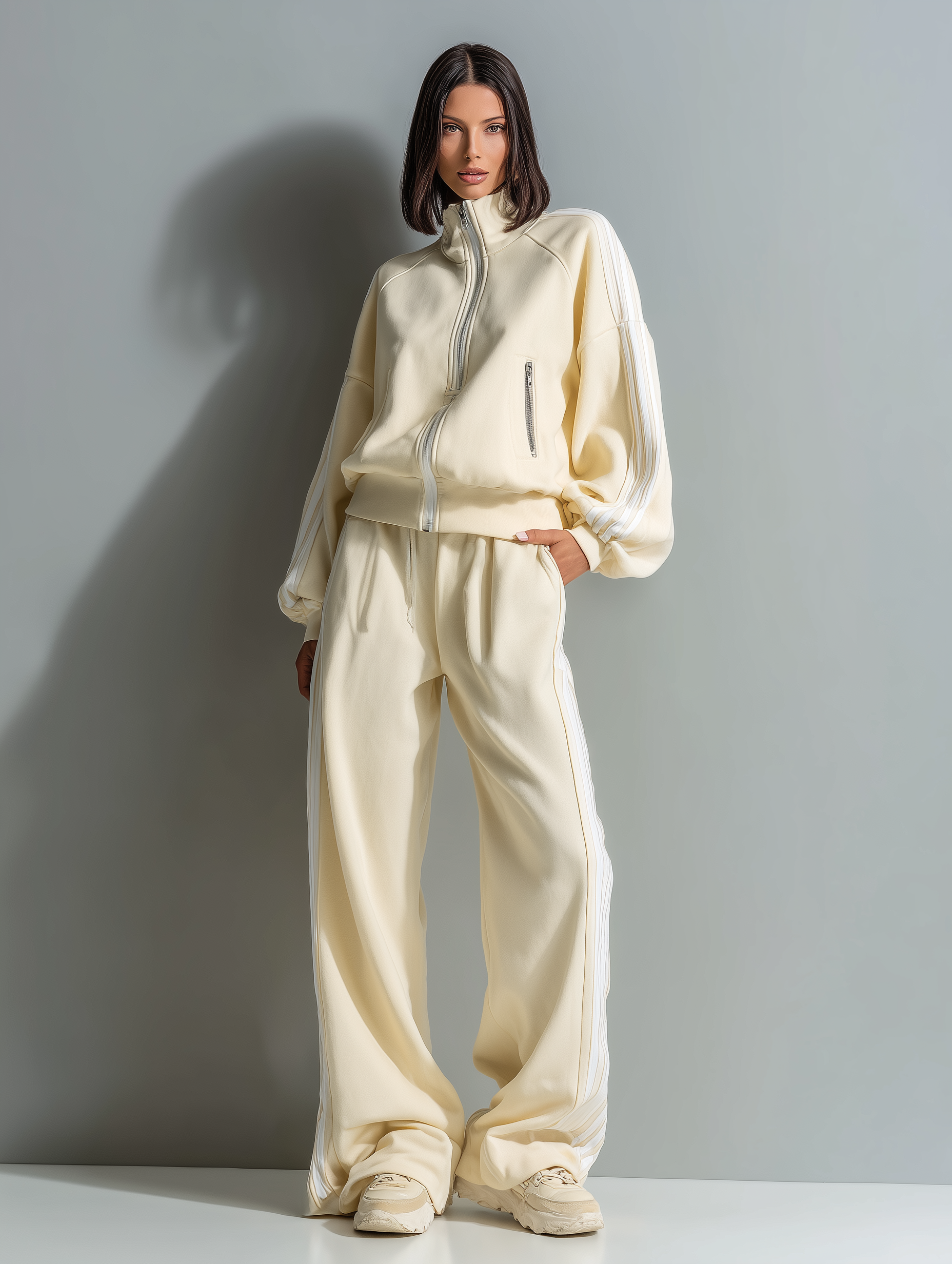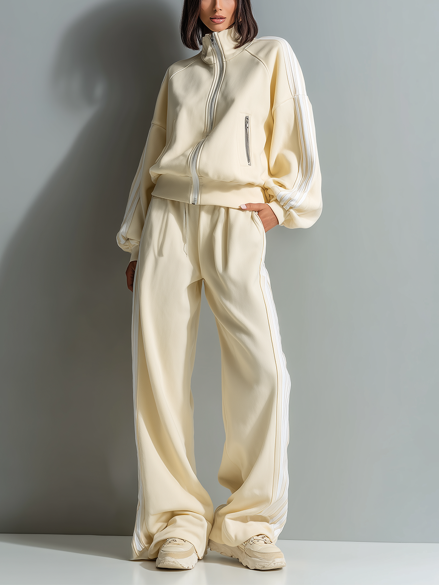 Women's Beige Air-layer Zip-up Loose-fitting Jacket And Straight-leg Trousers Set MDA0323K9T