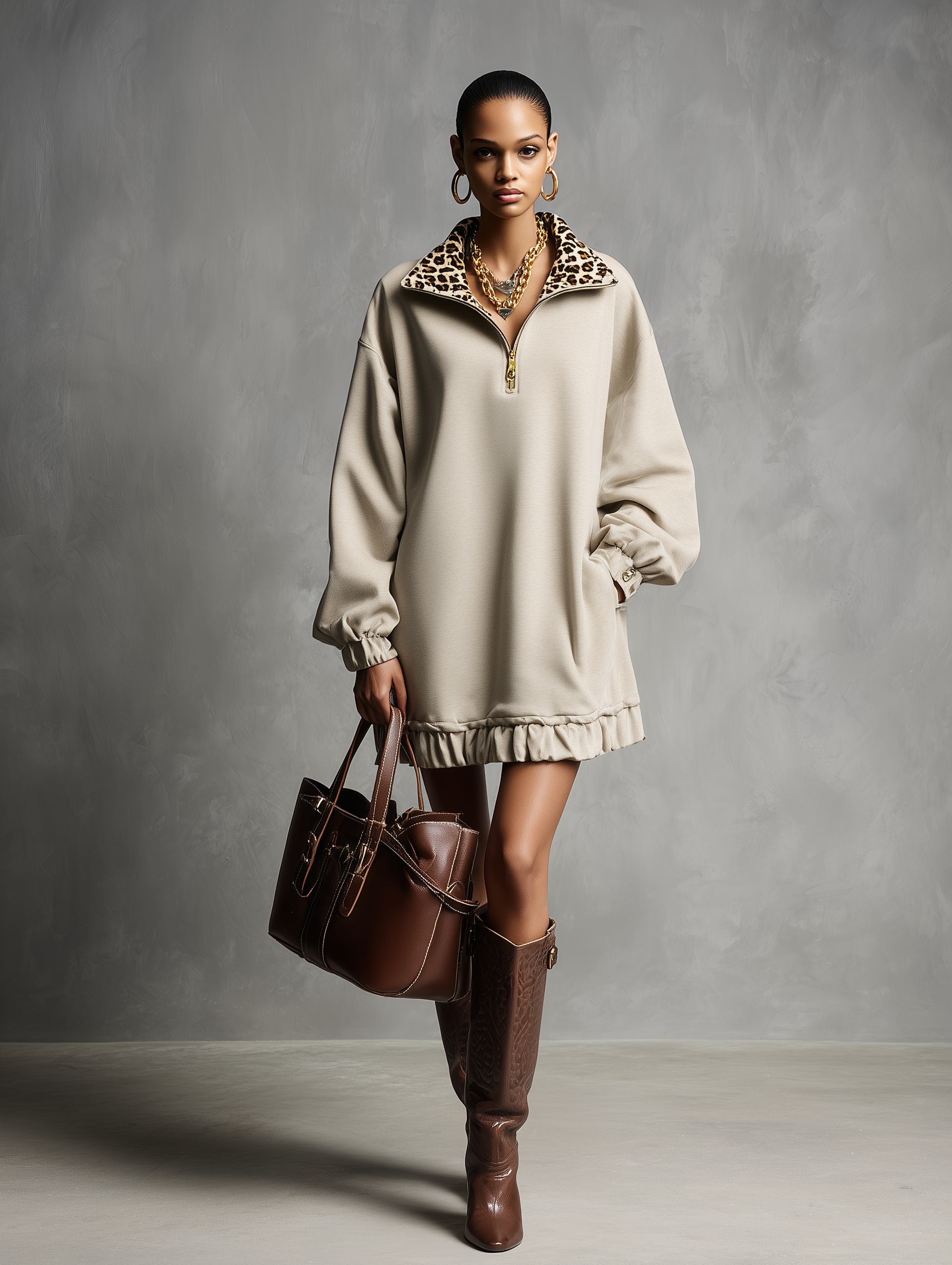 Women's Beige Cotton Blend Leopard Print Collar Mini Dress MDA0332K5T