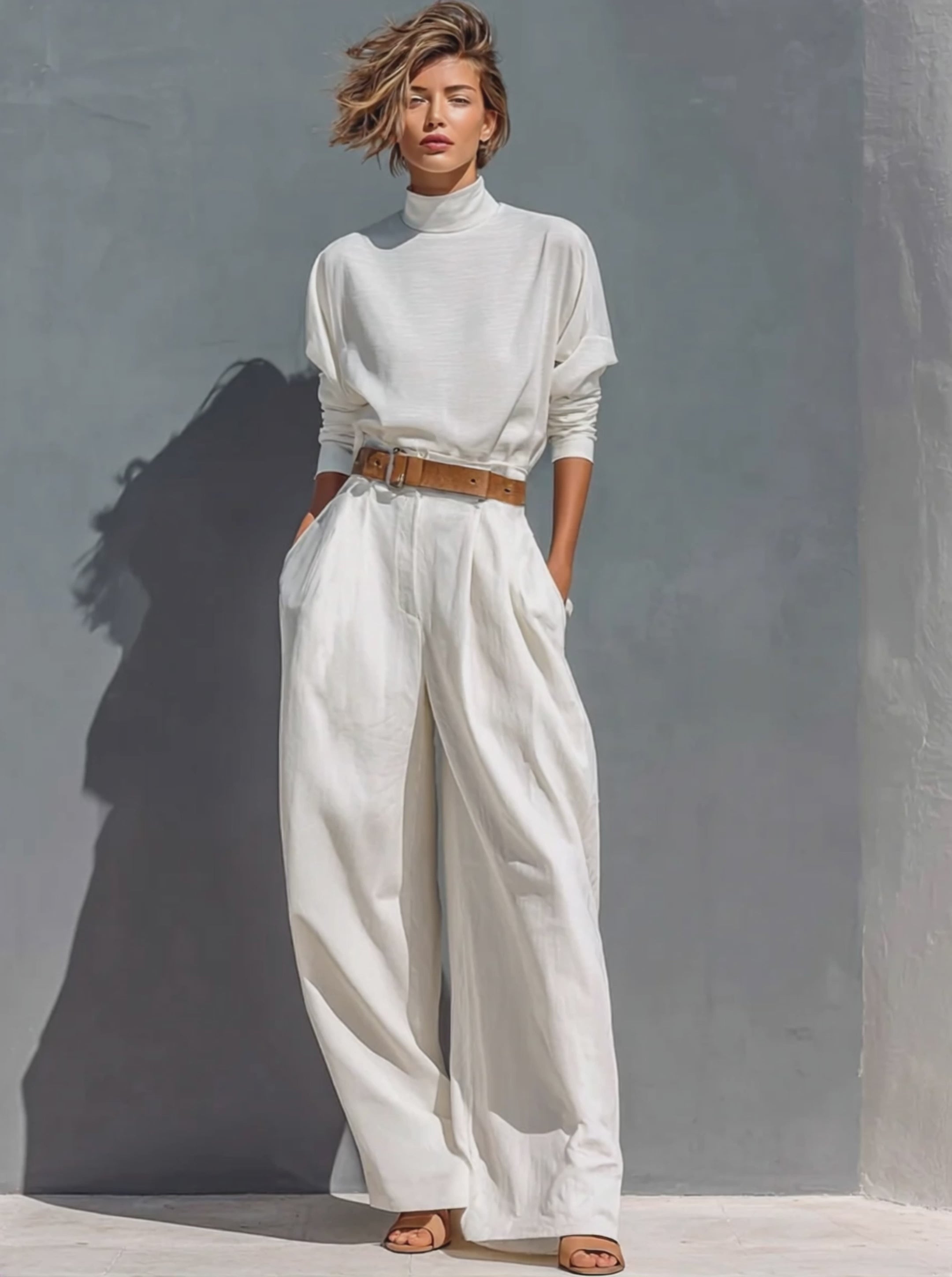 Women's All White Half High Neck Long Sleeve Loose T-shirt Wide Legs Two-piece Set (Belt Not Included)MDA2407G3Y