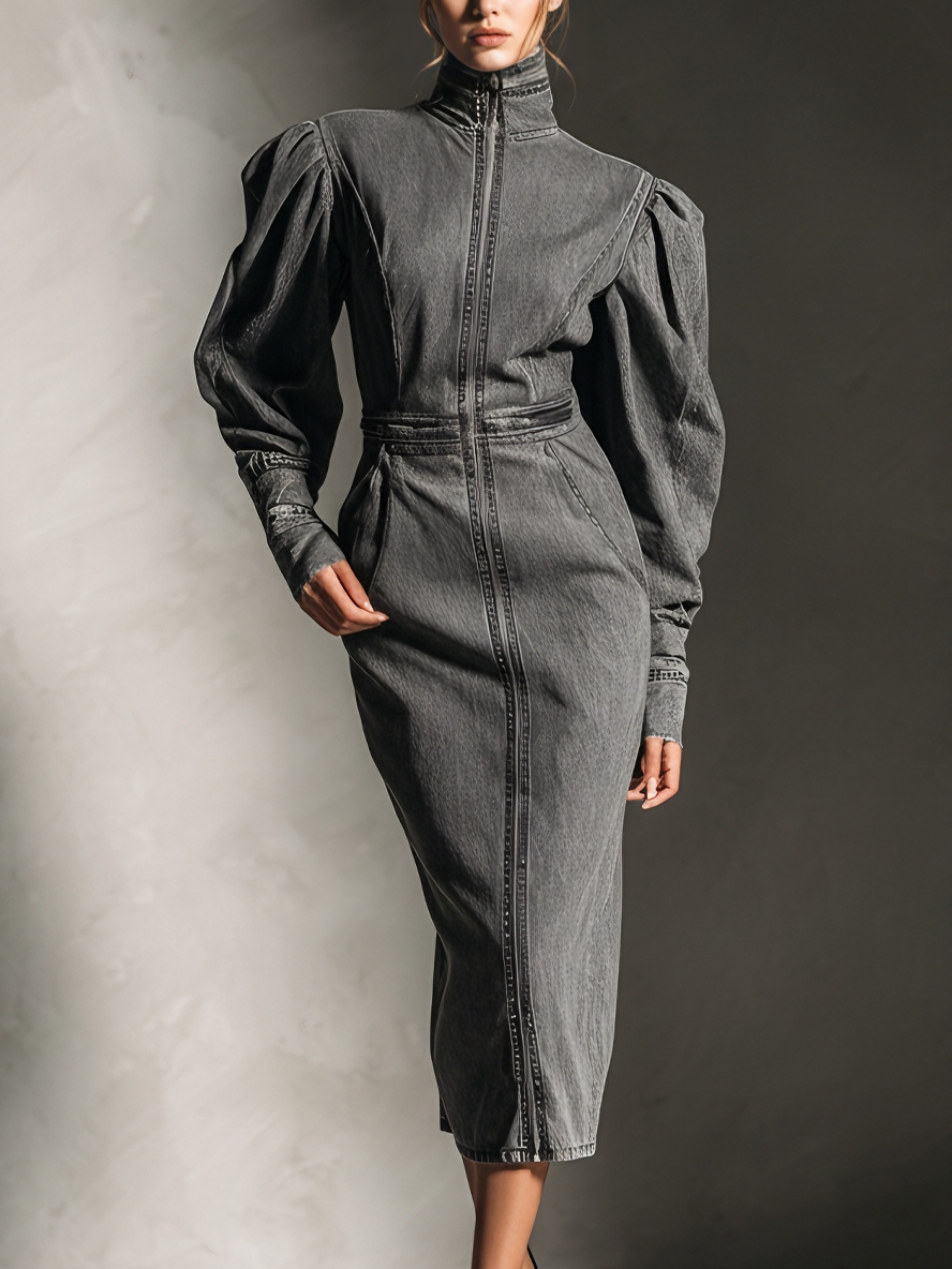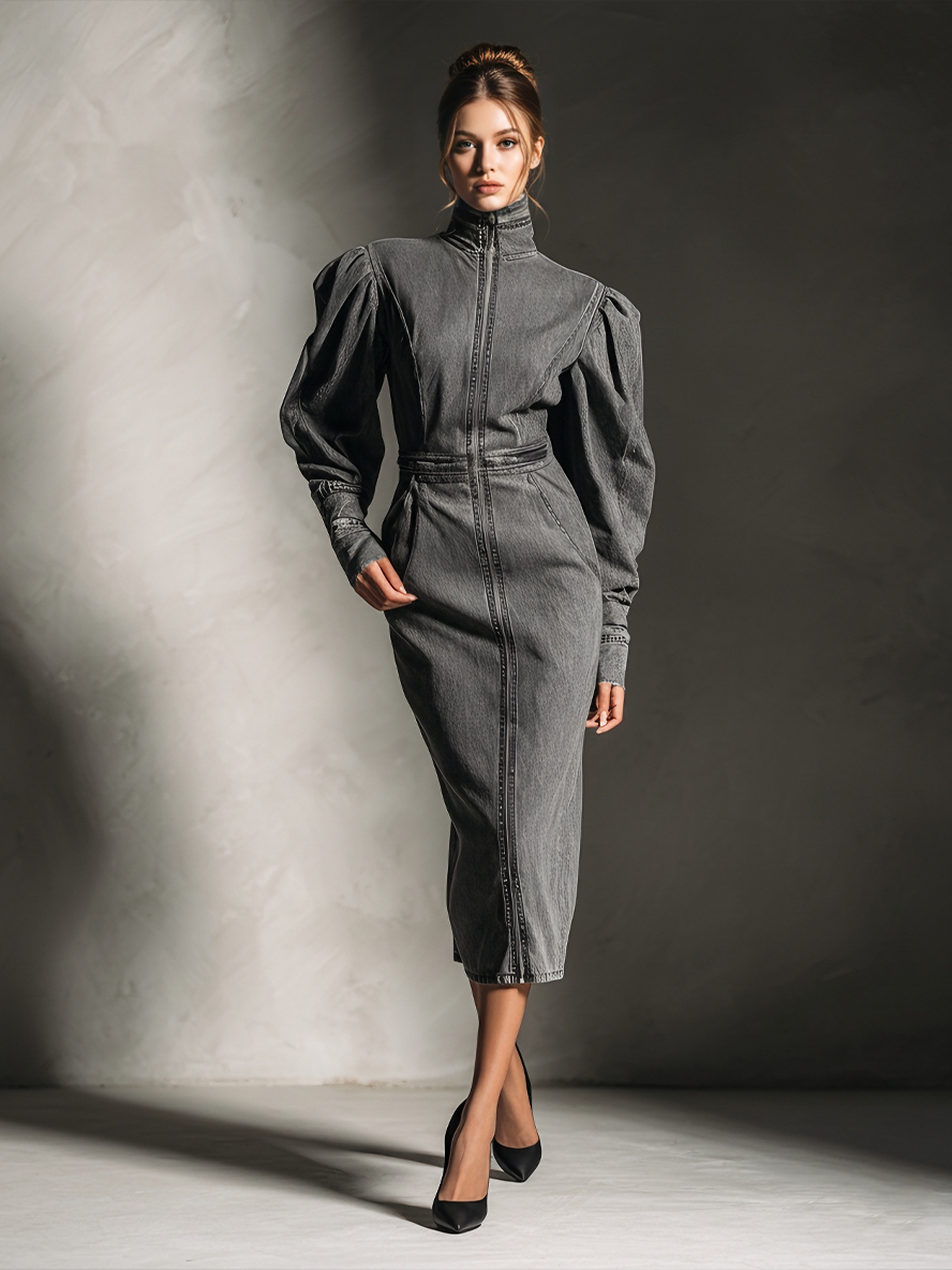 Women's Edgy Denim Blackened Gray Stand-Collar Puff-Sleeve Zip-Front Midi Dress MDA1622L9AU