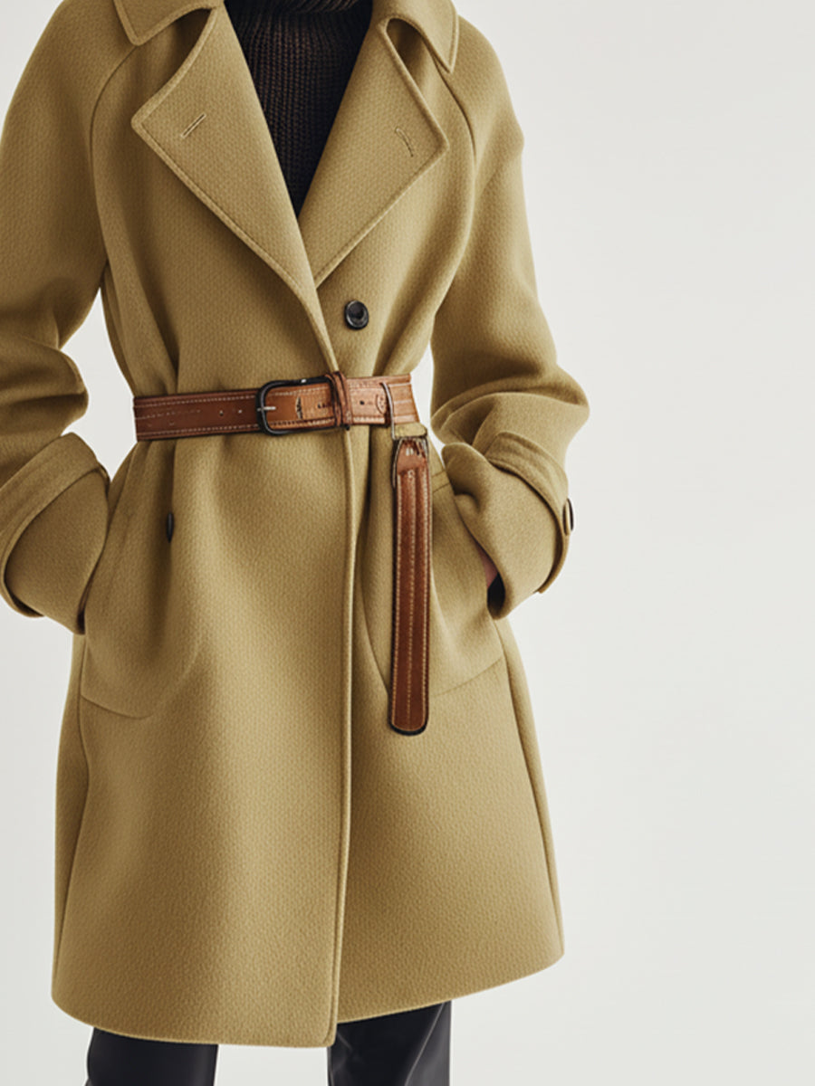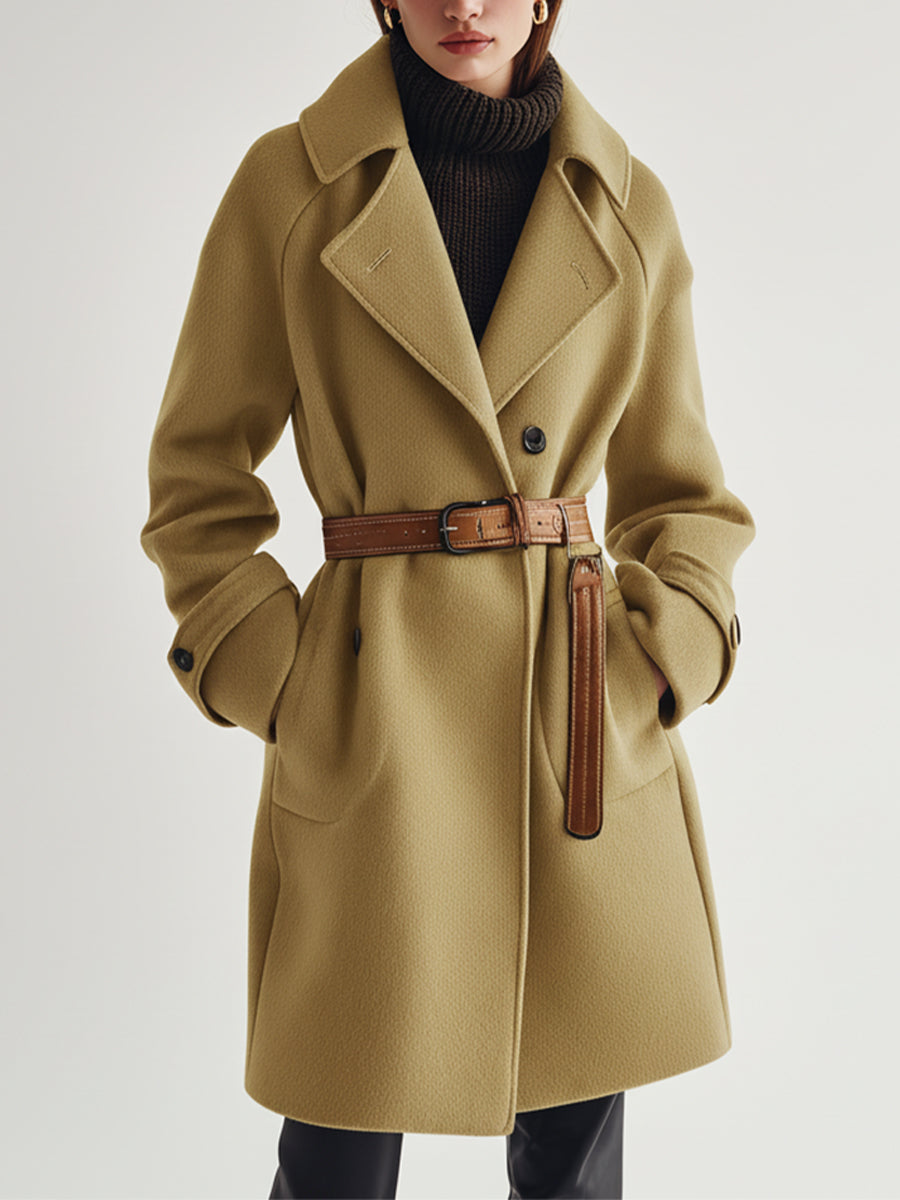 Women's Beige Wool-blend Elegant Belted Lapel Mid-Length Coat MDA3136J1I