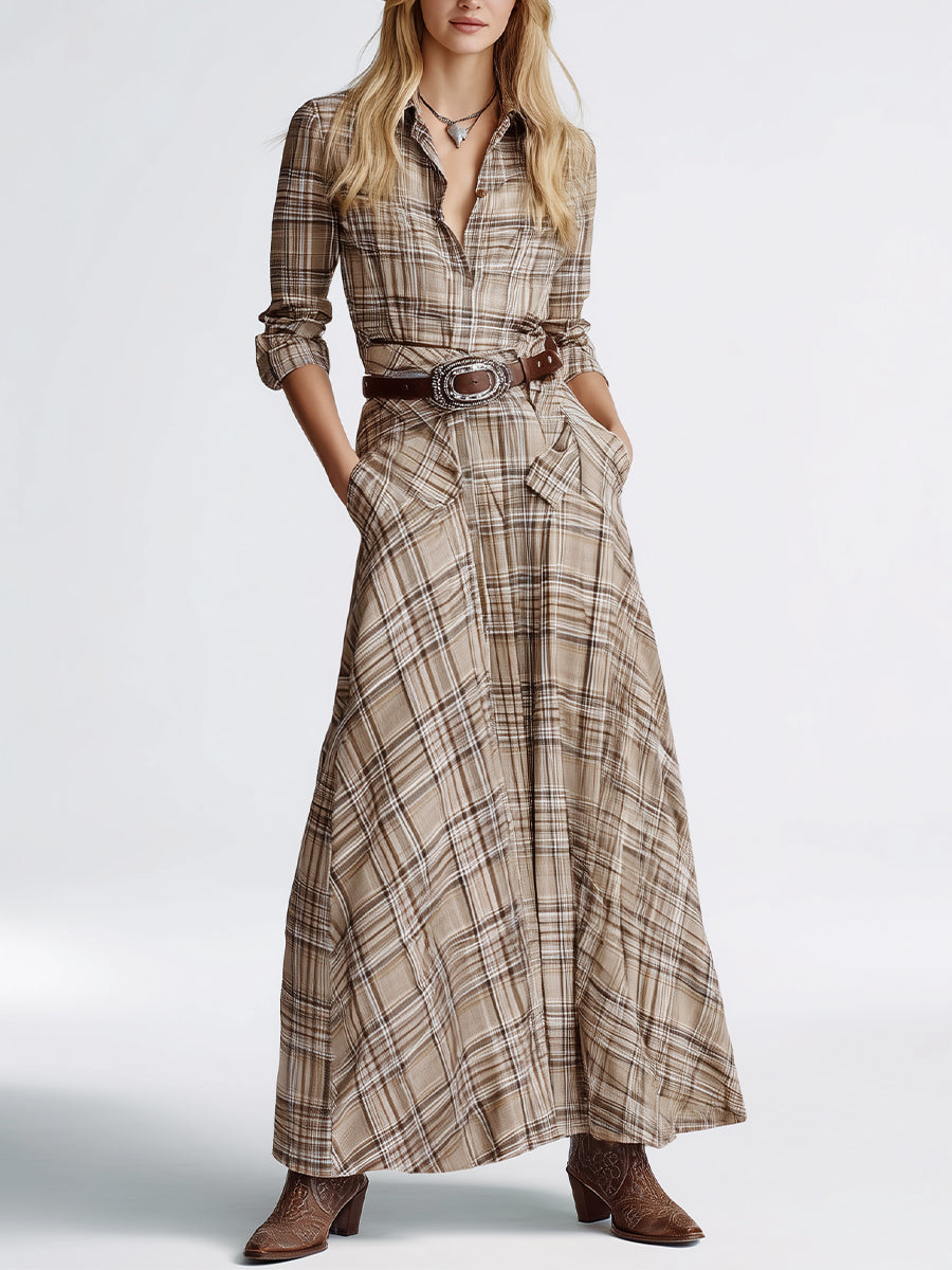 Women's Beige Plaid Shirt Dress With Maxi Length & Tie-Waist, Retro Western Fashion Dress MDA2706J2I
