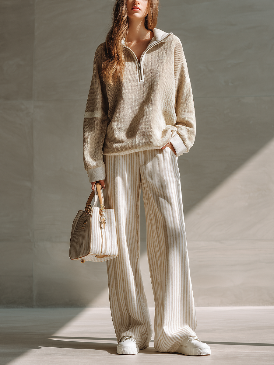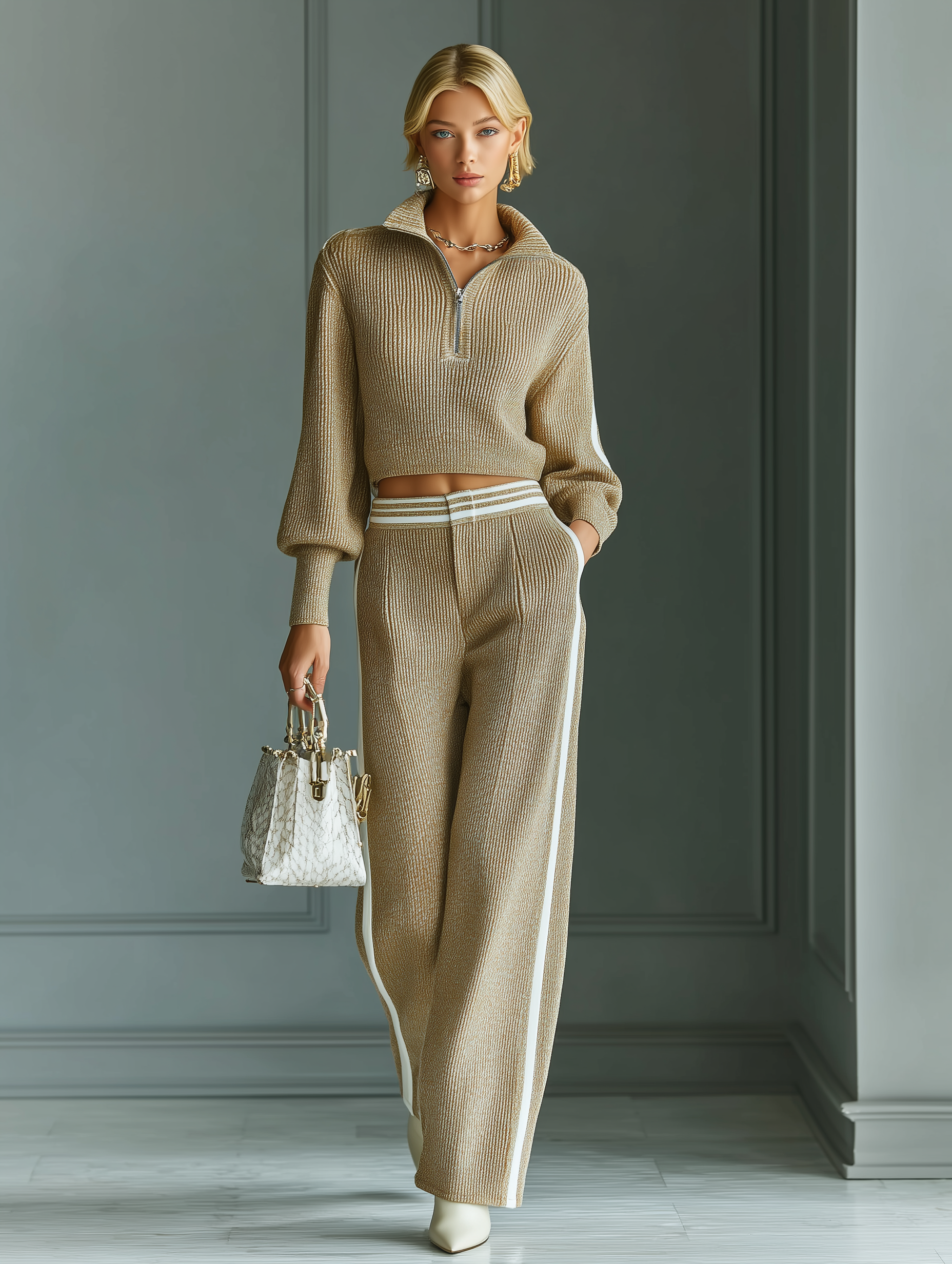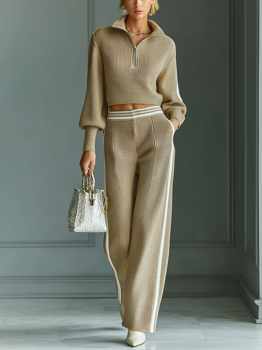 Women's Beige Knit Half-Zip Stand-Up Collar Top And Straight-Leg Pants Set MDA2776J2T