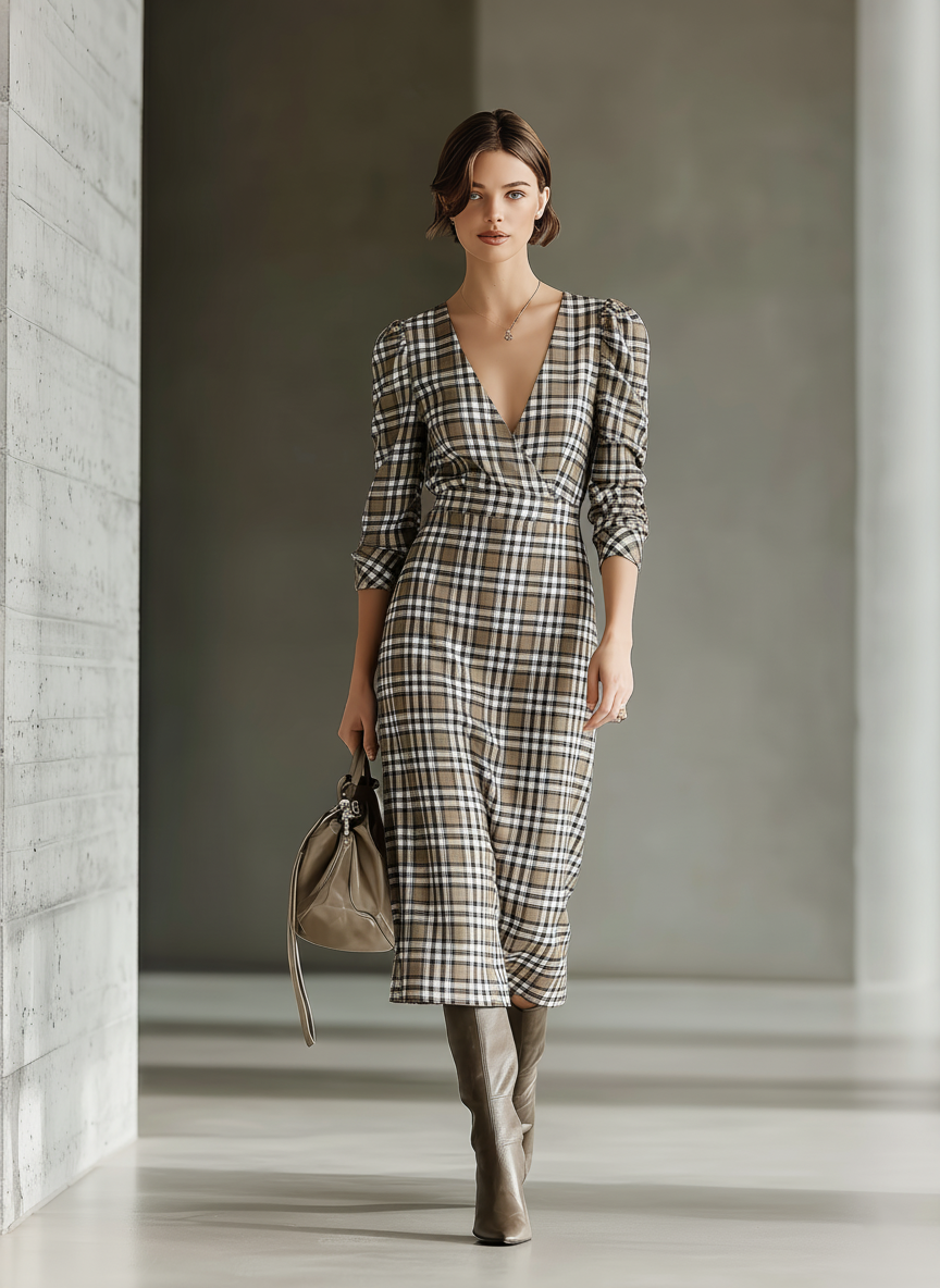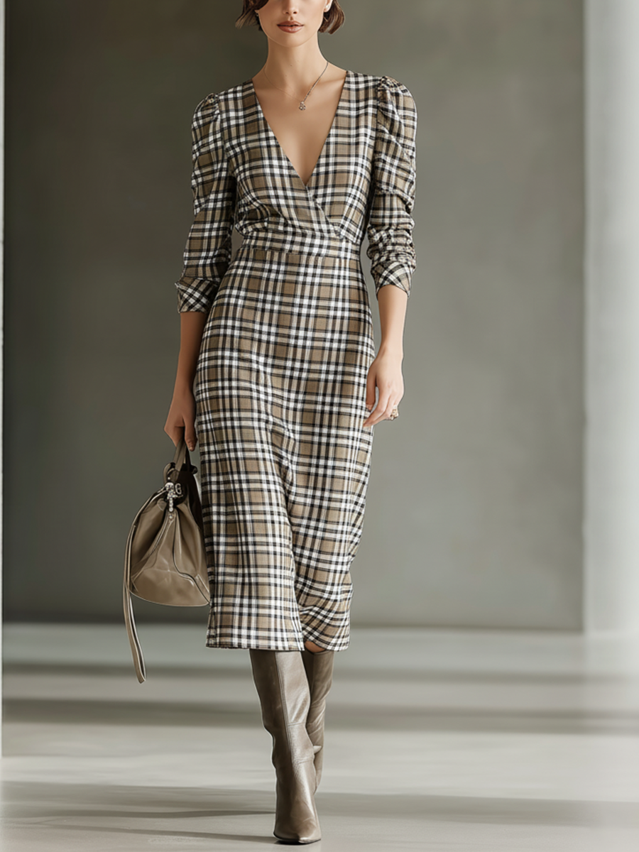 Women's Beige Plaid Cotton Blend Midi Dress MDA2525J4T