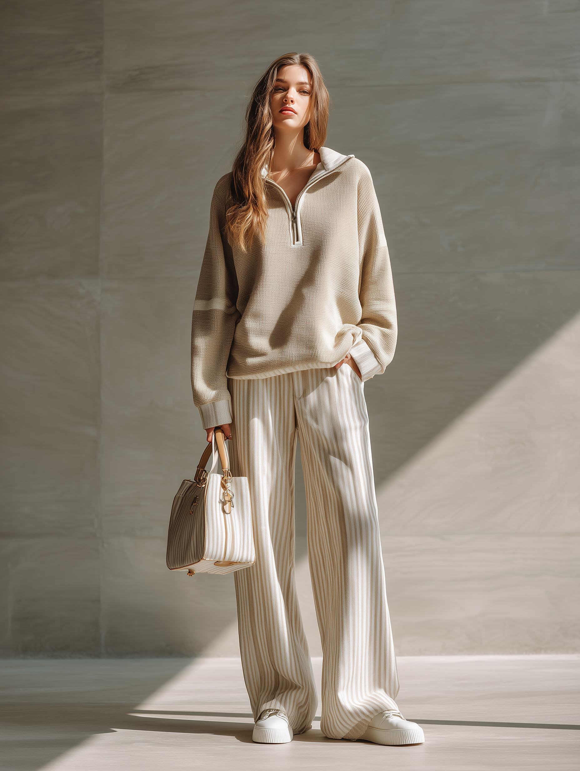 Women's Beige Waffle Knit Half-zip Loose Top And Straight-leg Pants Set MDA0321K5T