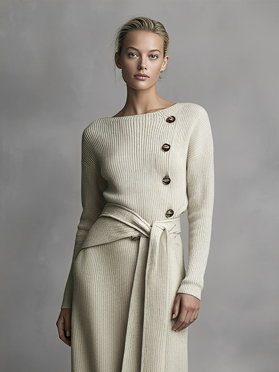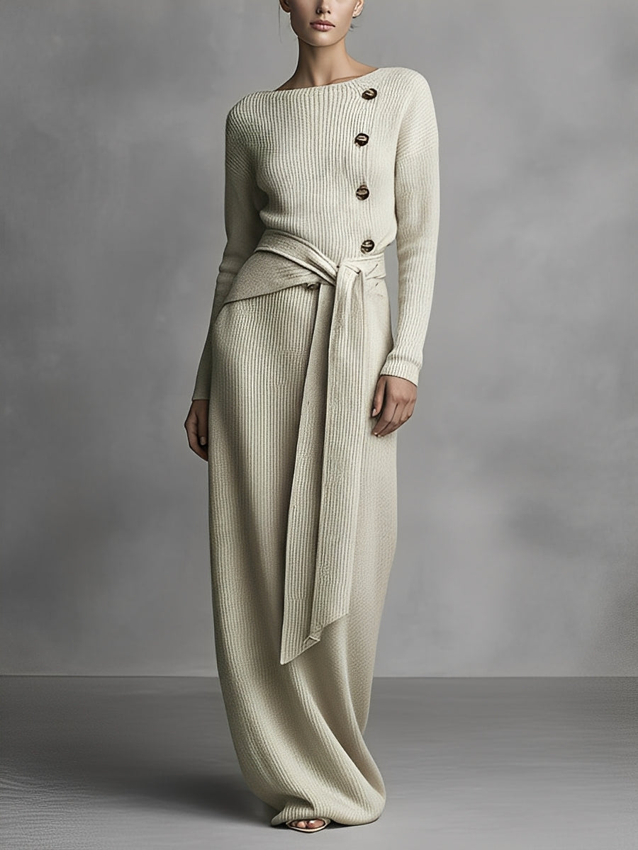 Women's Beige Knitted Elegant Maxi Dress With Asymmetric Buttons & Oversized Waist Belt MDA2209J5I