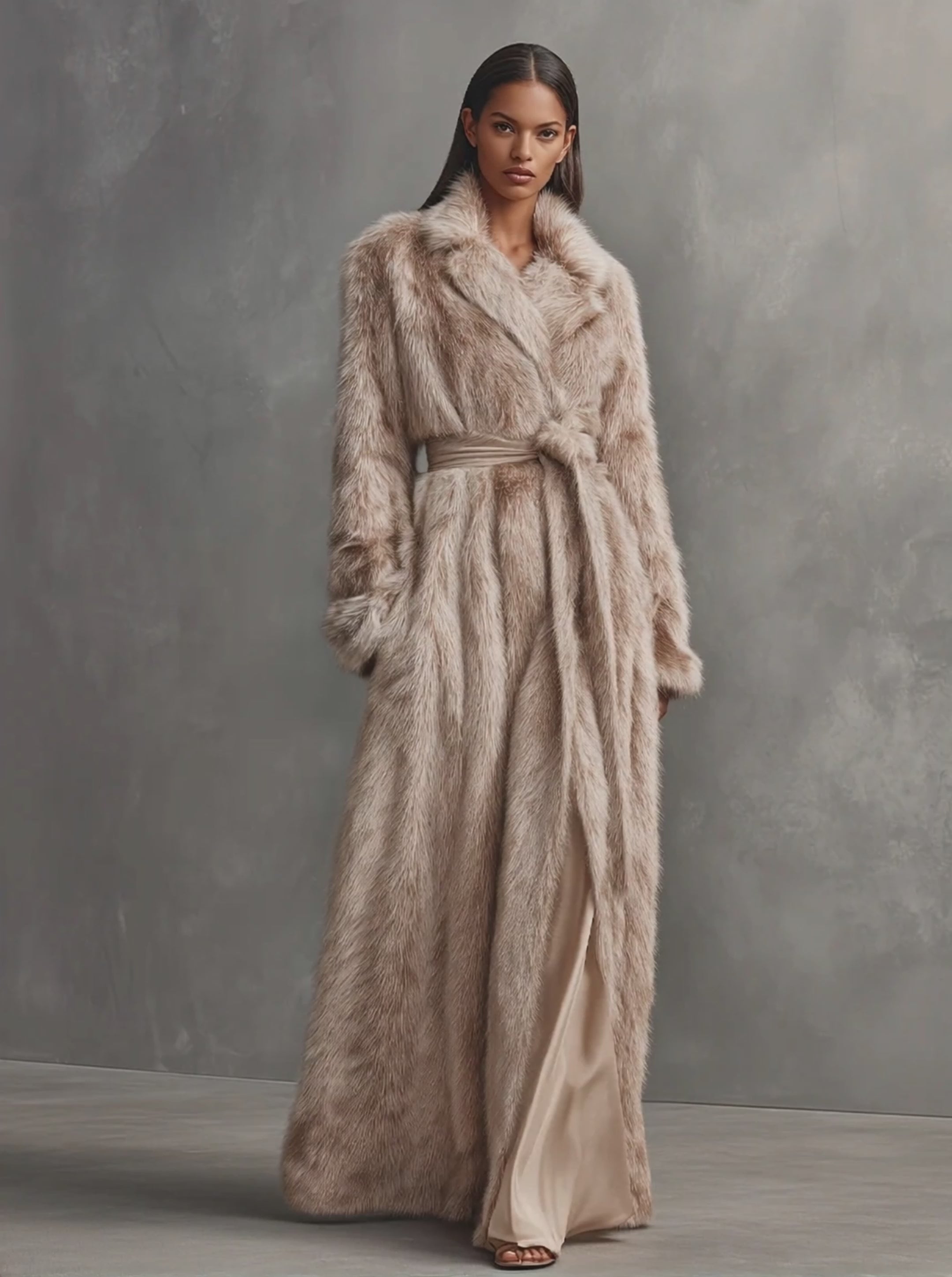 Women's Beige Luxurious Faux Fur Belted Longline Coat MDA2080J0I