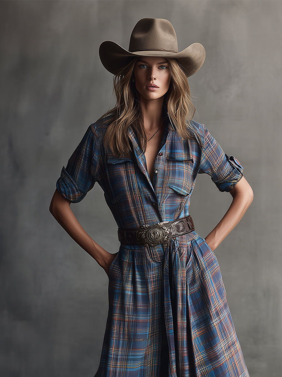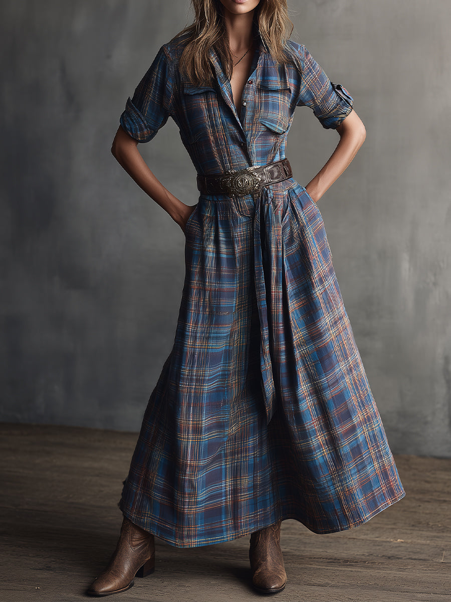 Women's Blue Plaid Shirt Dress With Maxi Length & Tie-Waist, Retro Western Fashion Dress (without belt) MDA2755J2I