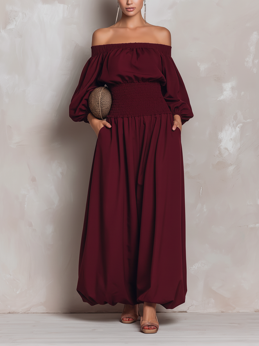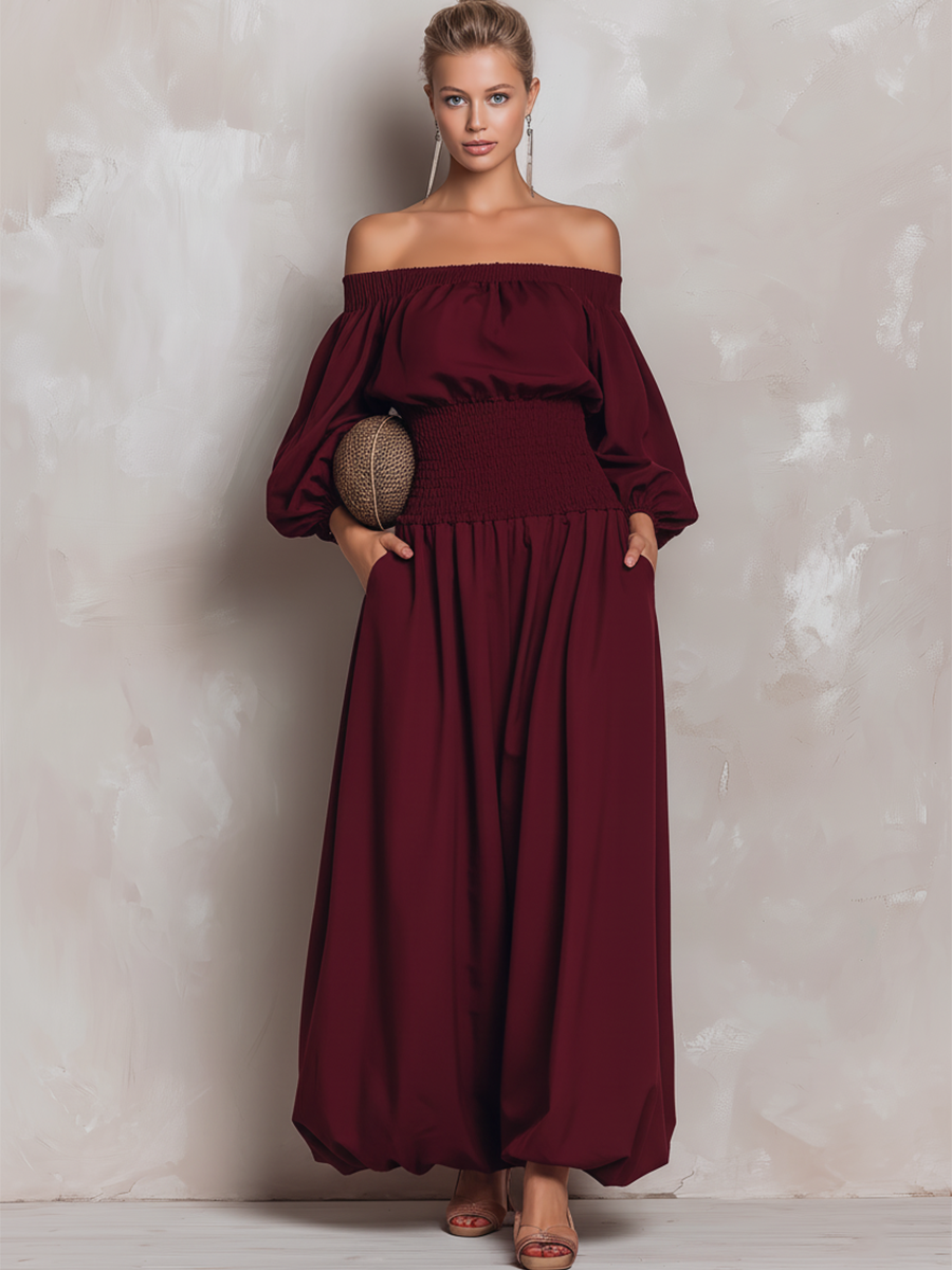 Women's Burgundy Cotton Blend Off-The-Shoulder Puff-sleeved Belted Long Jumpsuit MDA1107L8T