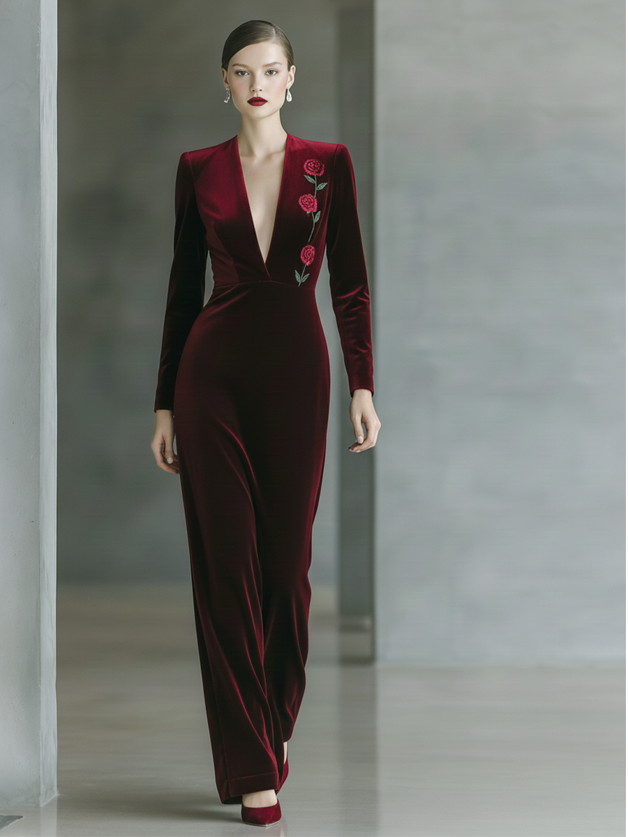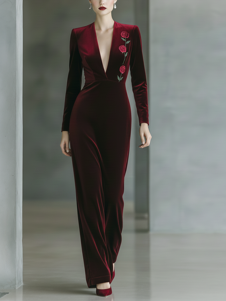 Women's Burgundy Velvet Fabric Deep V-Neck Embroidered Rose Maxi Dress MDA1275L7T