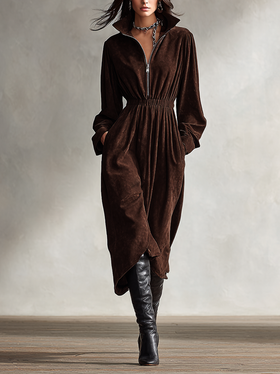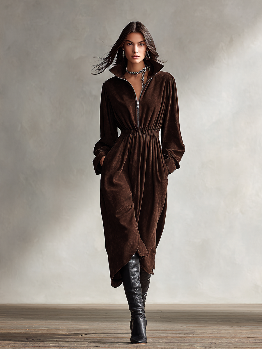 Women's Brown Suede Zip-Up Midi Dress MDA0845L9AP