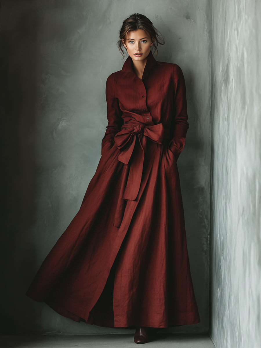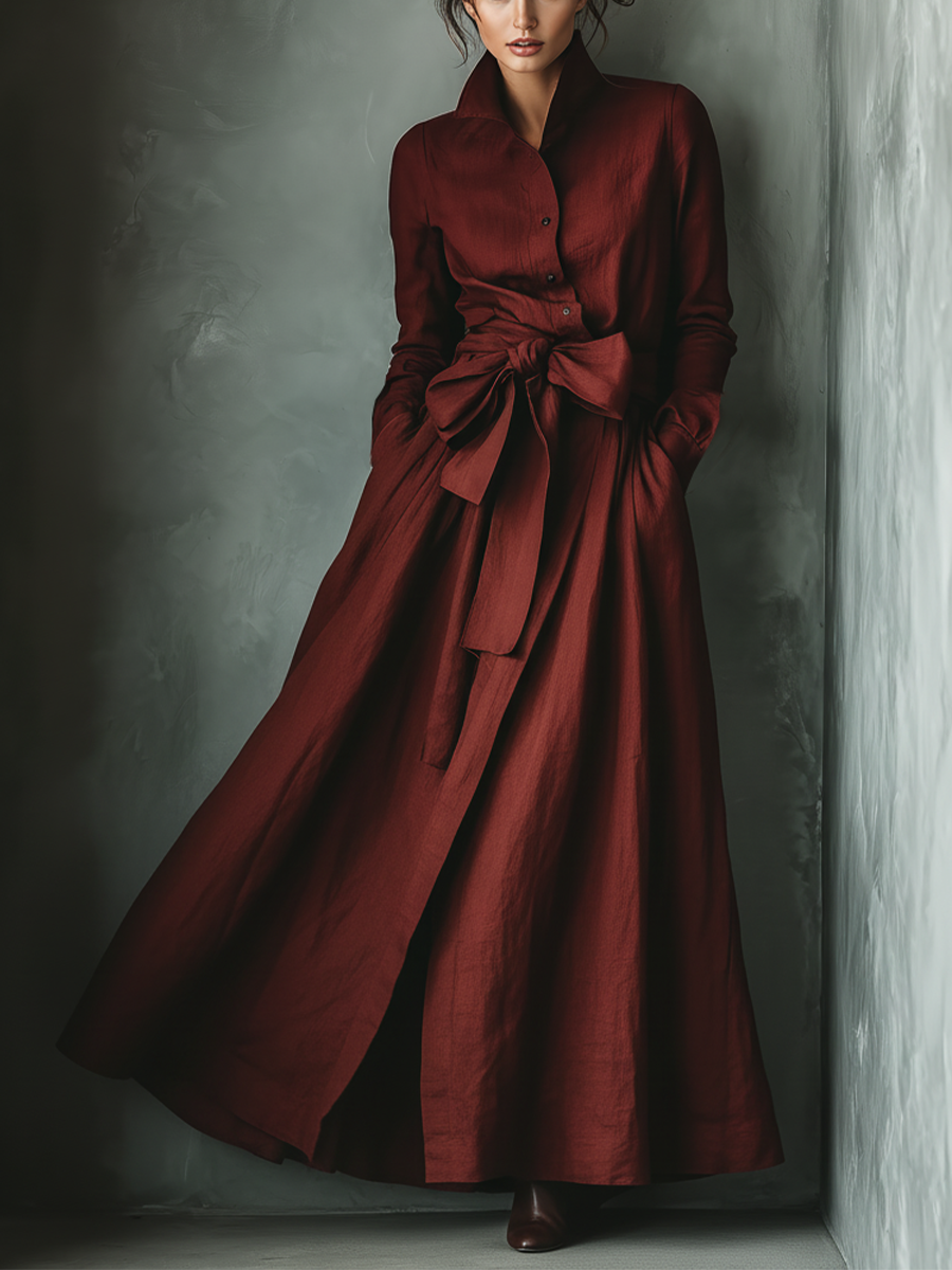 Women's Burgundy Linen Blend Blouse And Bow-tie Fitted Lapel Long Skirt Set MDA0156L8T