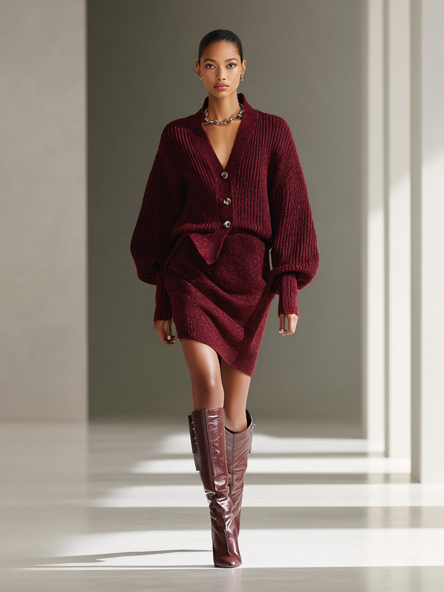 Women's Burgundy Ribbed Knit Cardigan And Mini Skirt Set MDA1216L3AP