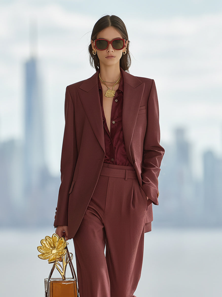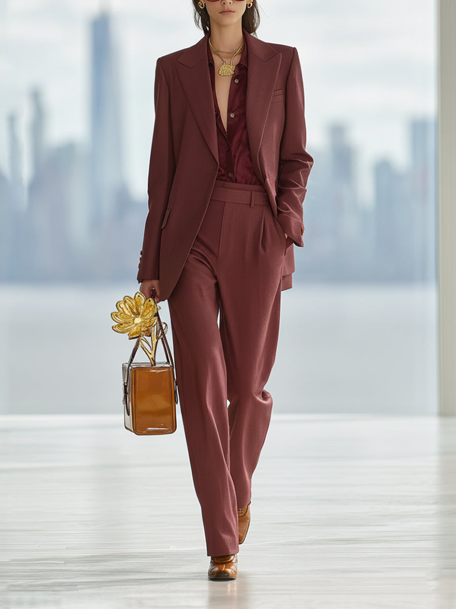 Women's Burgundy Structured Fabric Sophisticated Pinstripe Blazer & Pant Set MDA0533K9I