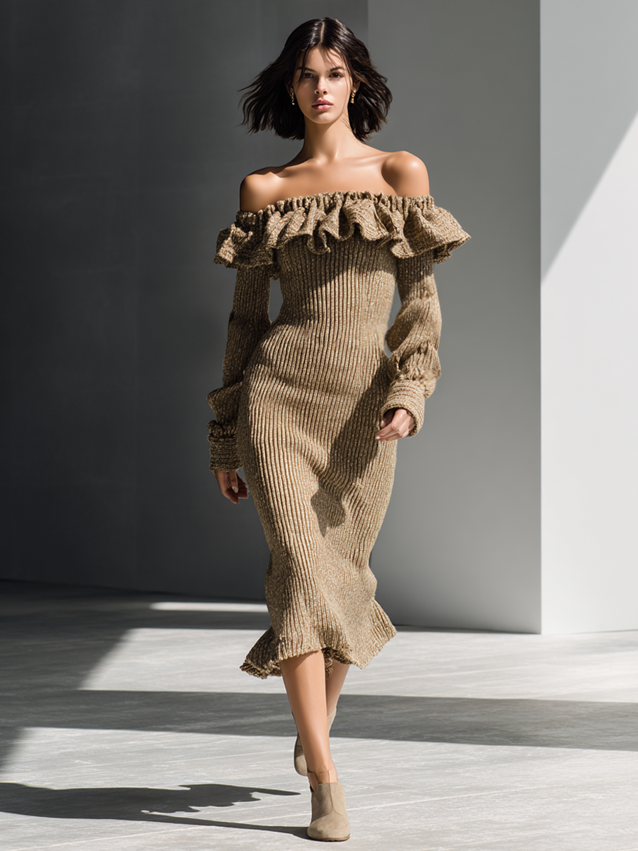 Women's Camel Ribbed Knit Off-Shoulder Ruffle Midi Dress MDA1011L0AP