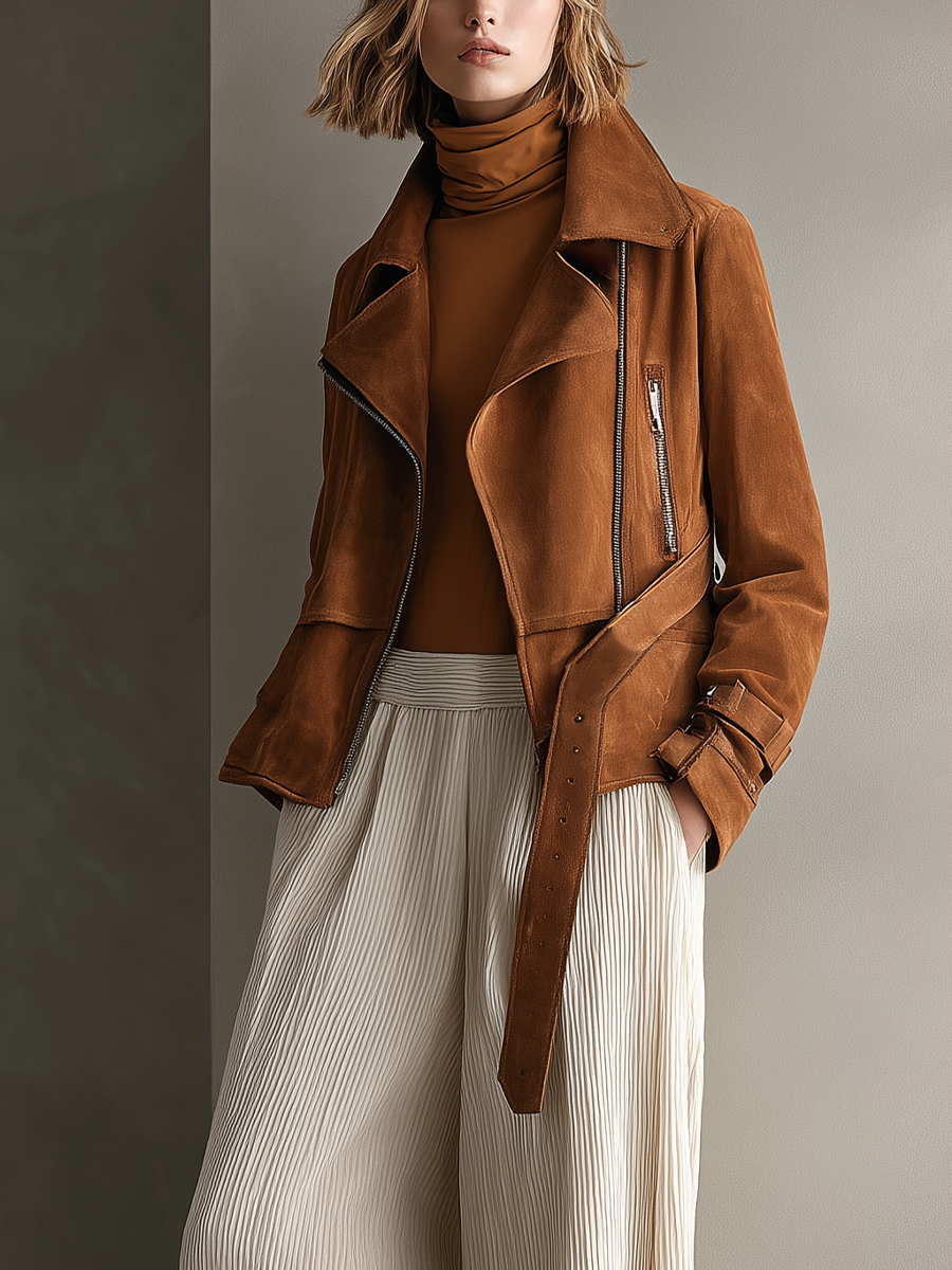 Women's Caramel-Colored Faux Suede Collared Short Jacket With Belt MDA3169J8T