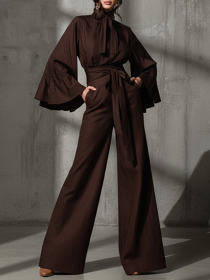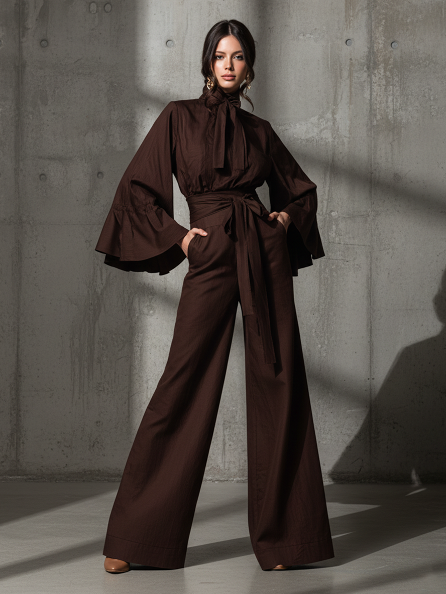 Women's Chic Linen-Blend Chocolate Brown Tie-Neck Flared-Sleeve Wide-Leg Pants Set MDA1644L1AU