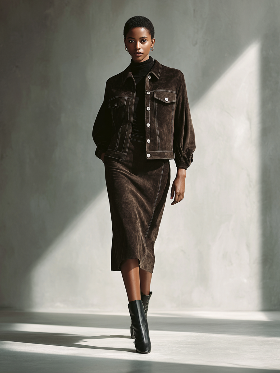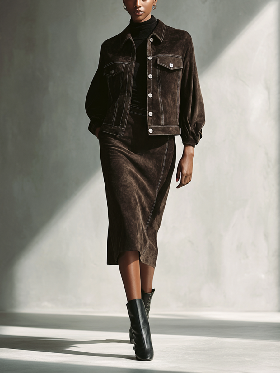 Women's Chocolate Brown Faux Suede Jacket And Skirt Set MDA1520L1AP