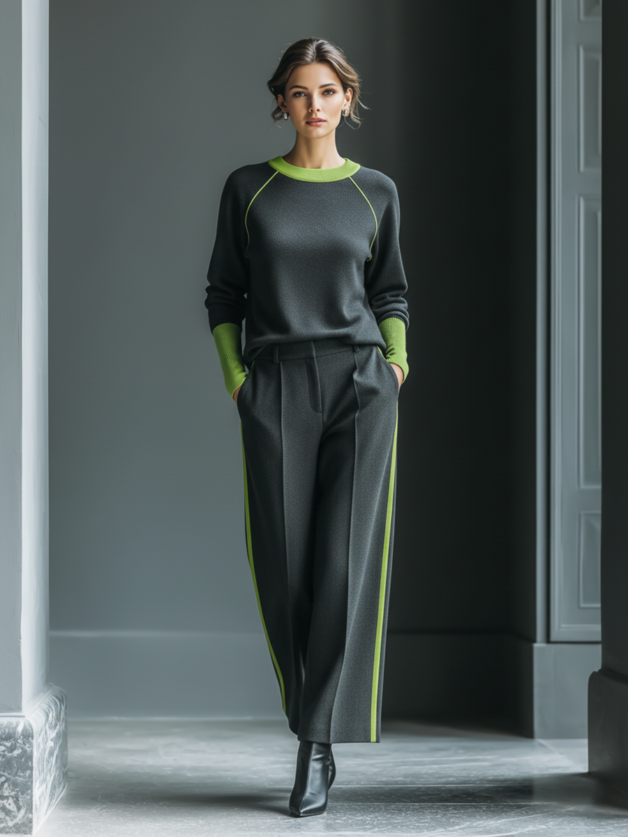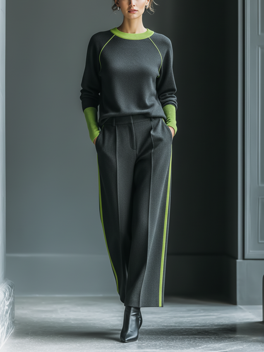 Women's Charcoal Knit Fabric Crew Neck Top With Lime Contrast & Wide-Leg Striped Pants Set MDA1559L3T