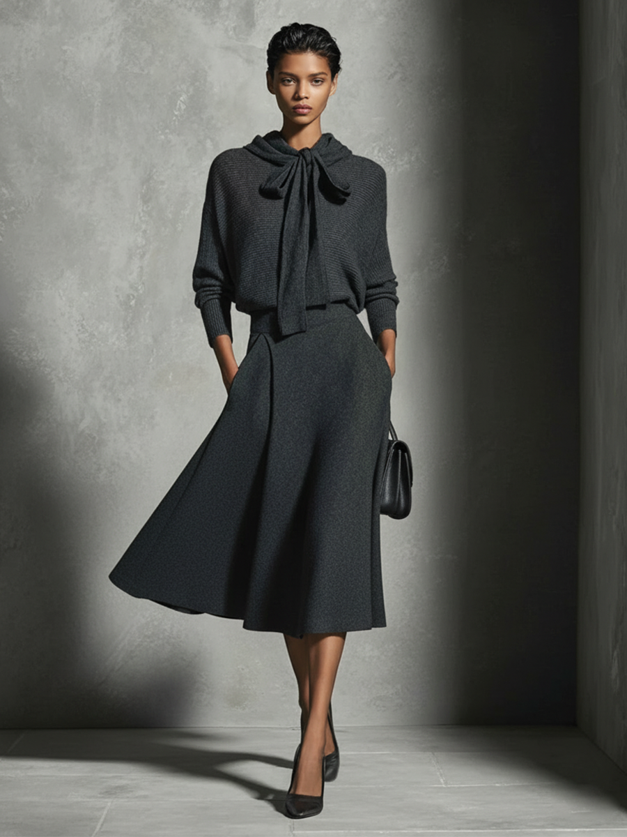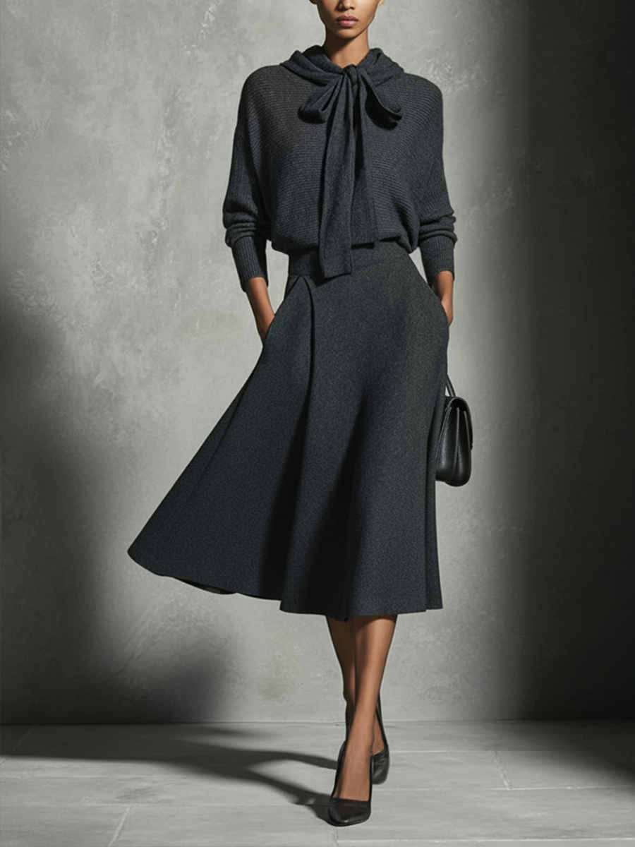 Women's Charcoal Gray Knitted Tie-Front Top And Flared Midi Skirt Set MDA1133L5AP