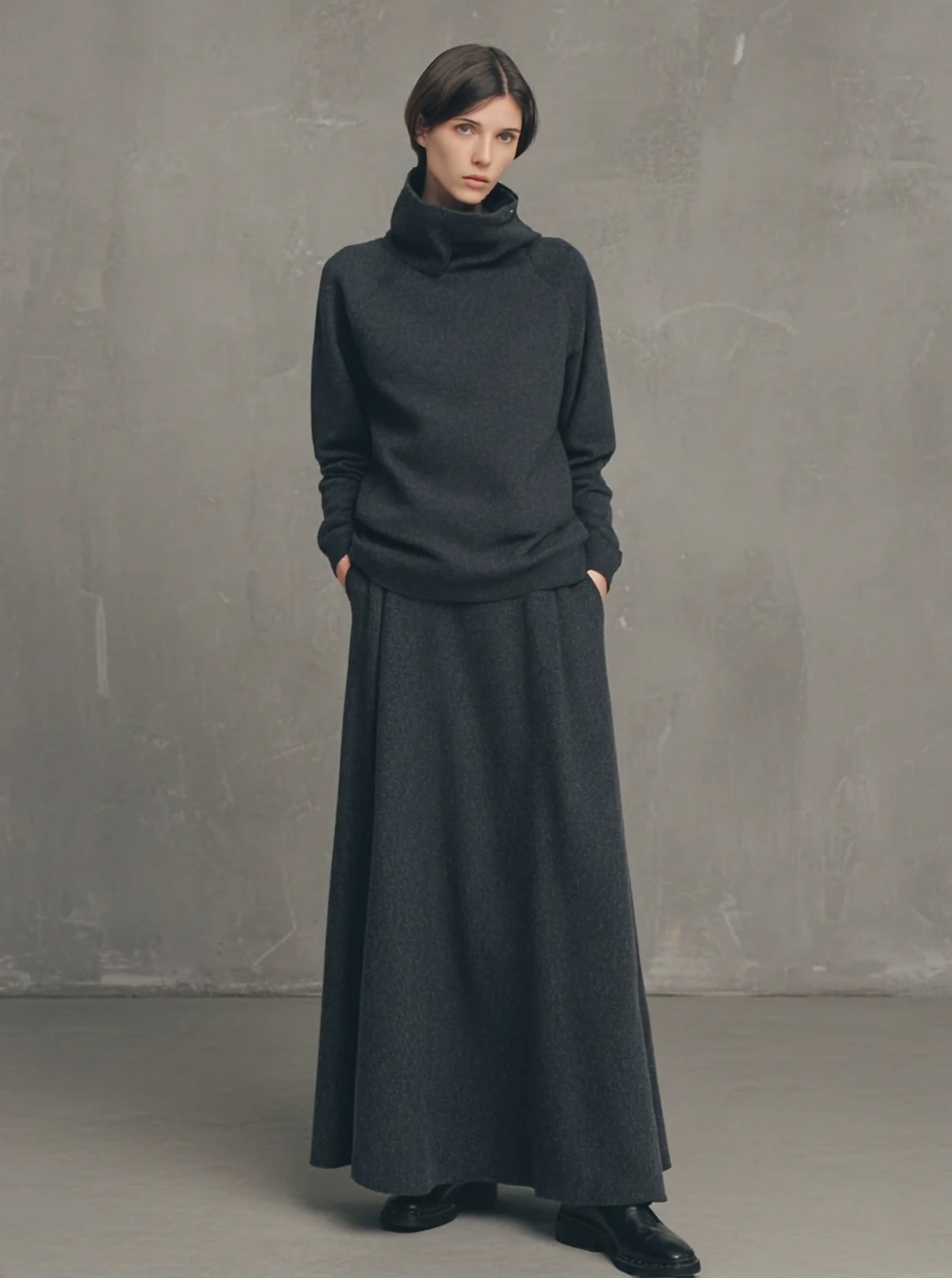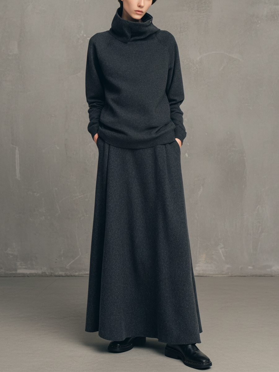 Women's Charcoal Gray Air-layer High-neck Top And Flared Long Skirt Set MDA1107L4T