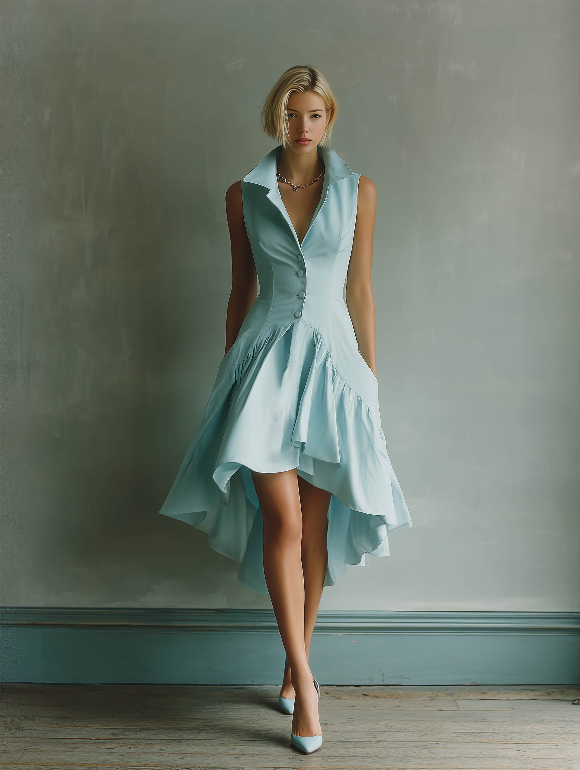 Women's Elegant Light Blue Woven Shirt Collar Sleeveless Long Dress MDZ1324B9AN