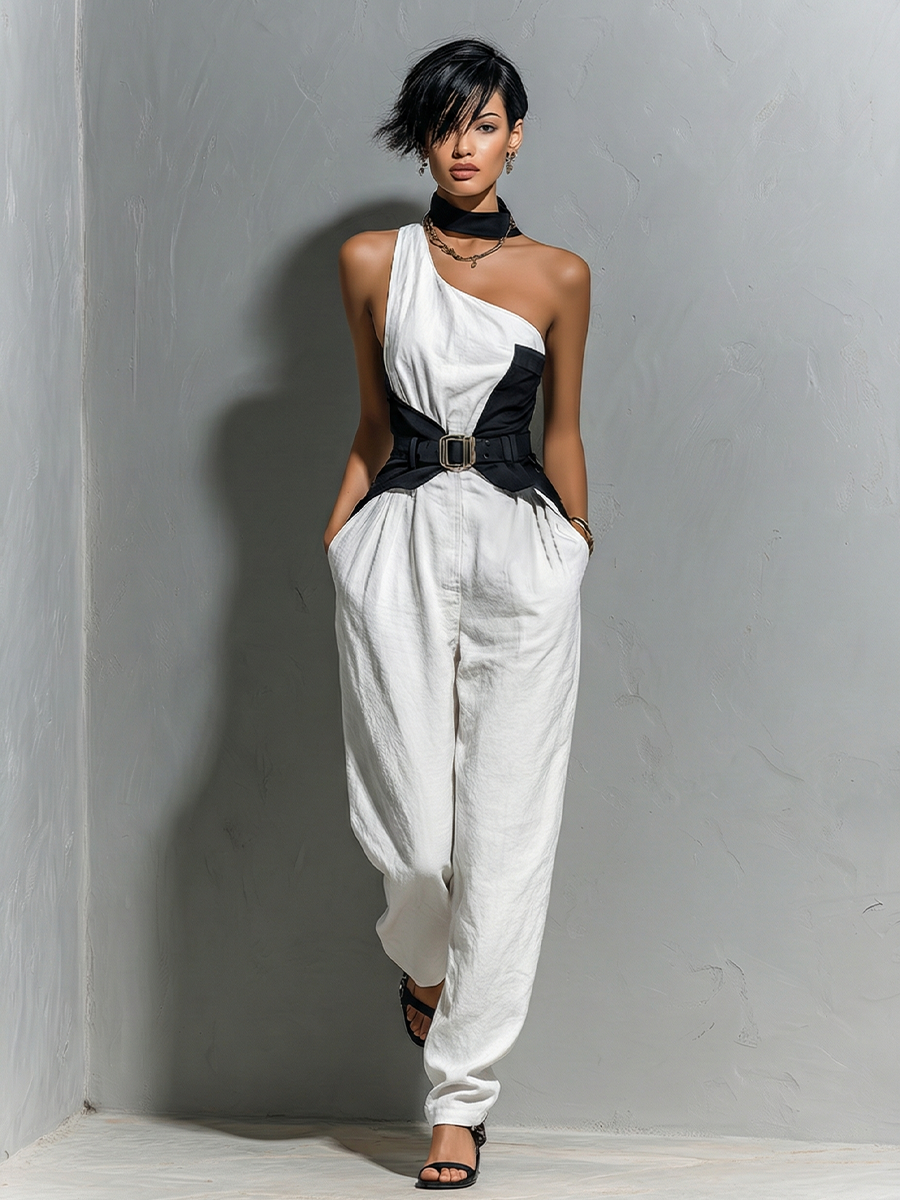 Women's White & Black Linen Jumpsuit With One-Shoulder Neckline & Buckled Waist Belt, Timeless Modern-Chic Style Jumpsuit (No Scarf Included) MDZ0322C1I