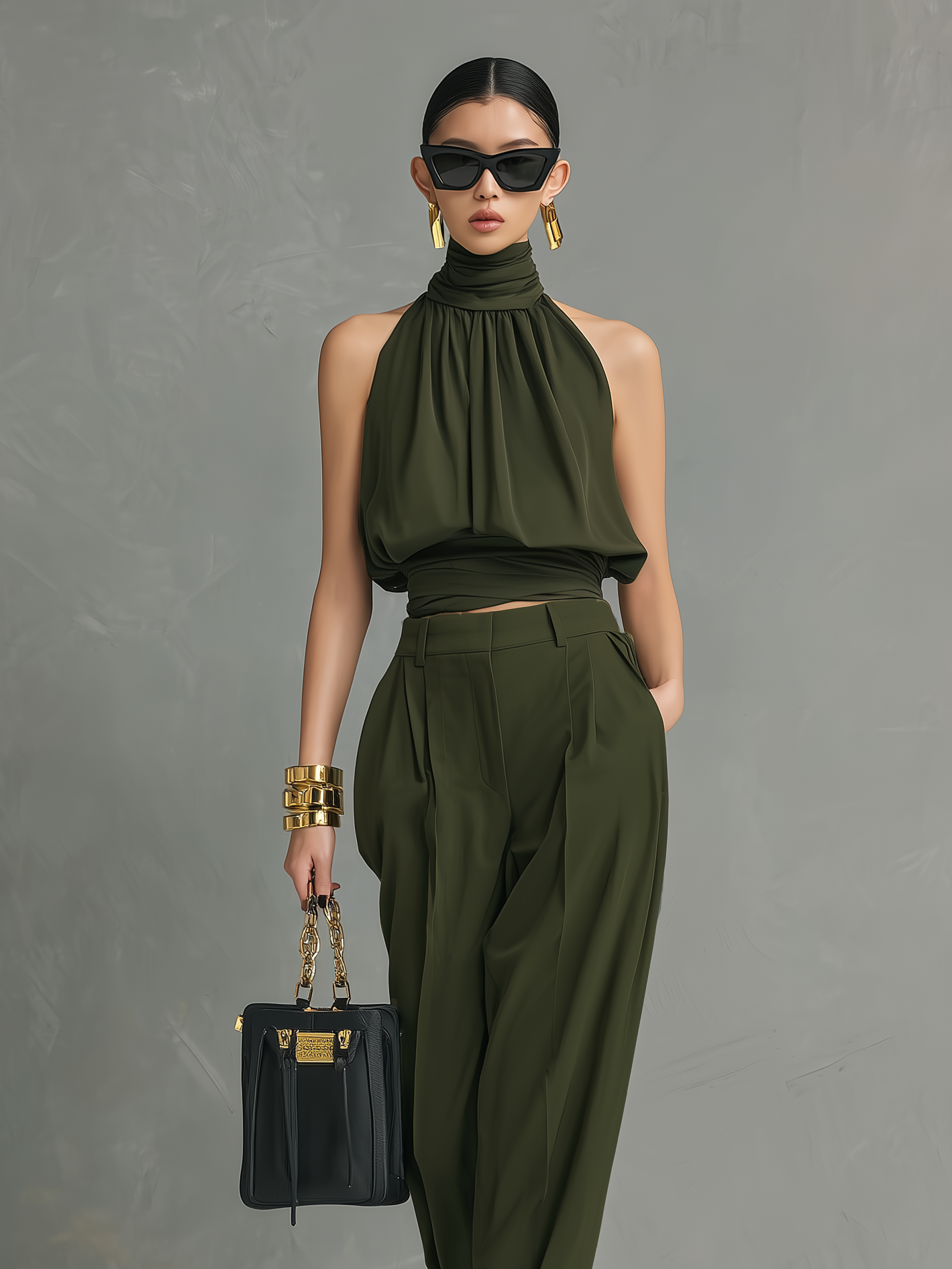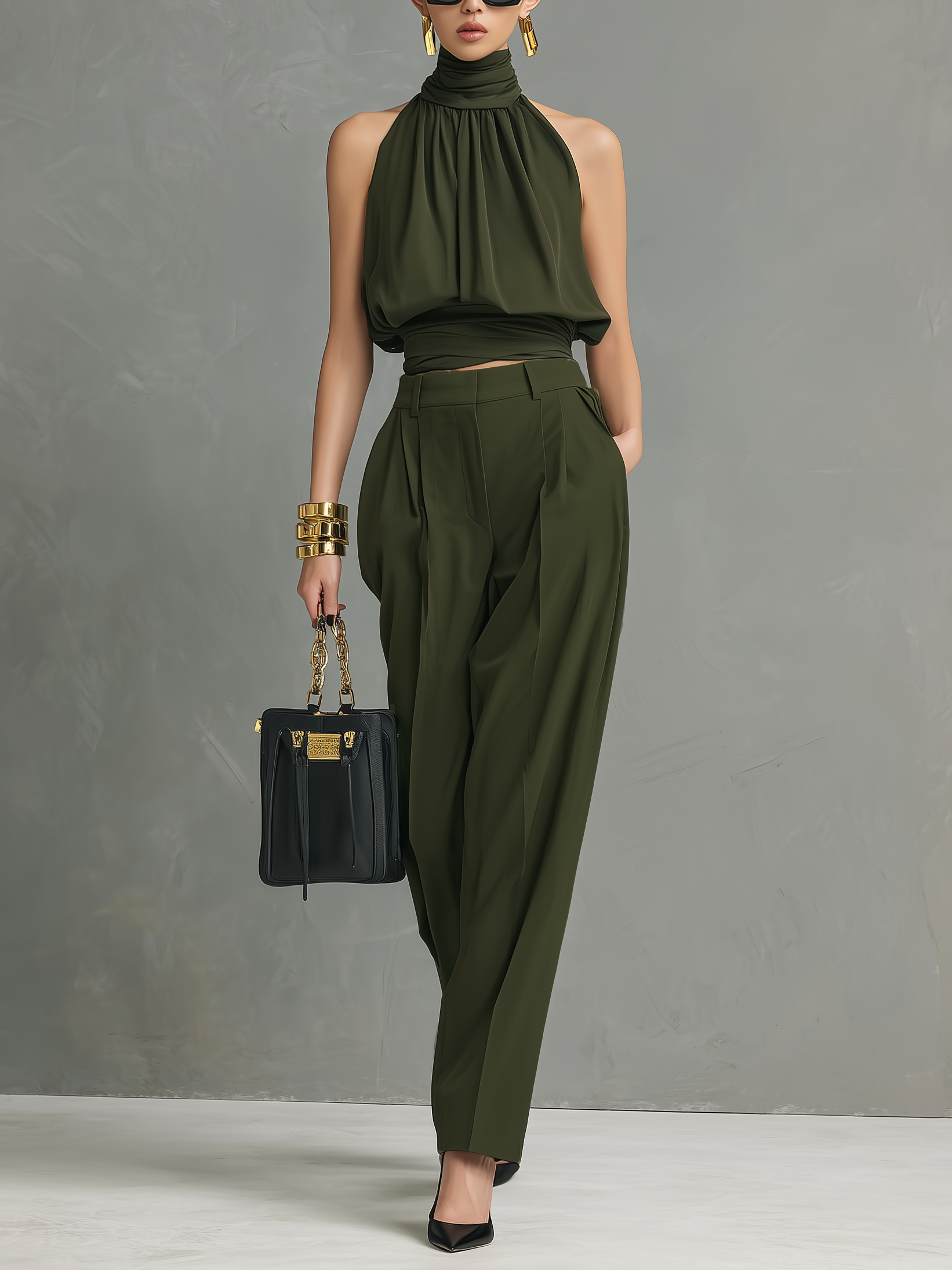 Women's Elegant Dark Green Chiffon Round Neck Sleeveless Top Paired With Matching Woven Trousers Set MDZ0380C9AN