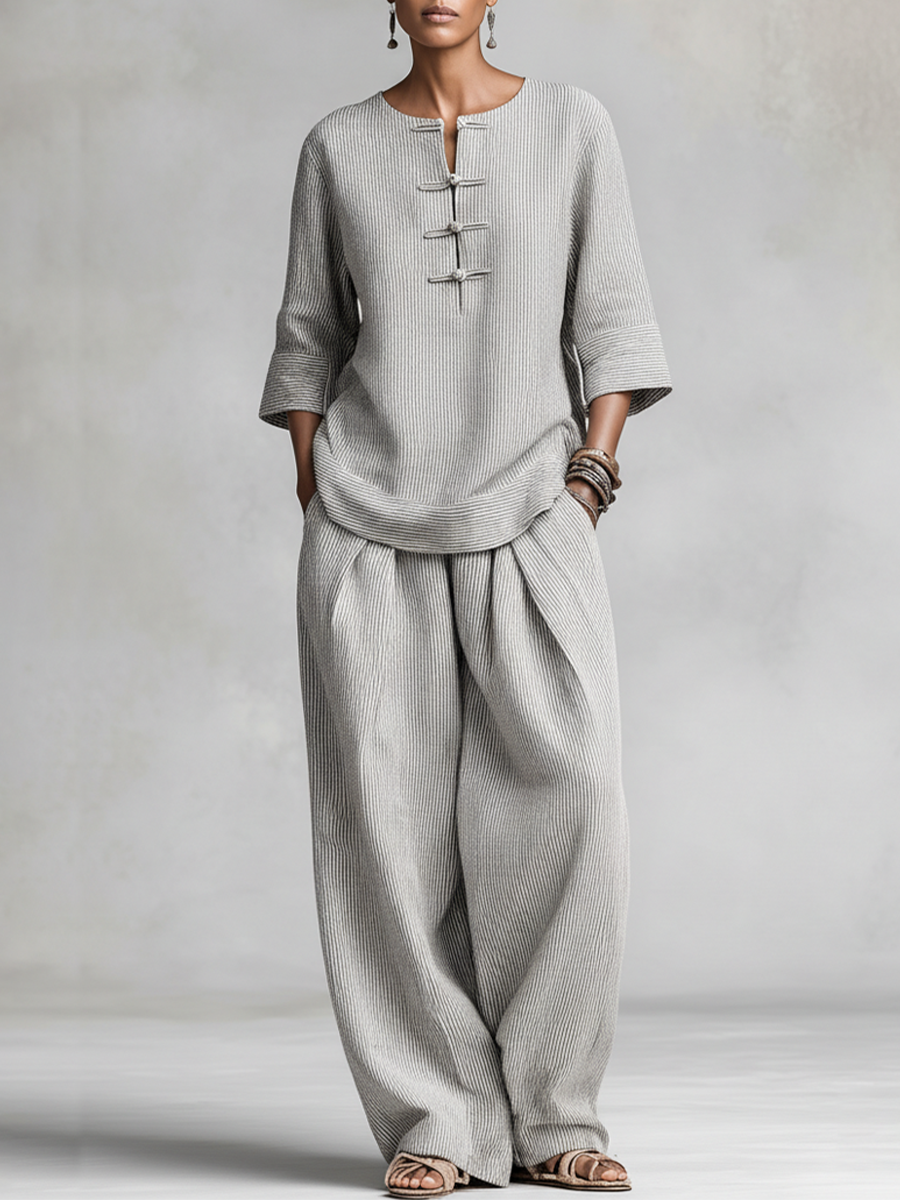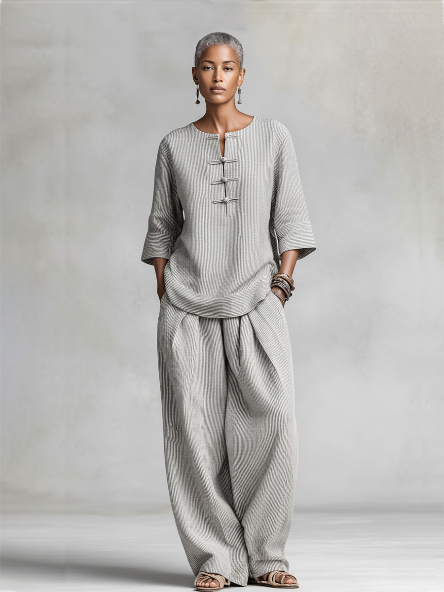 Women's Grey Striped Set With Frog Button Blouse & Wide-Leg Pants, Timeless Ethnic-Minimalist Style Set MDZ0378C9I