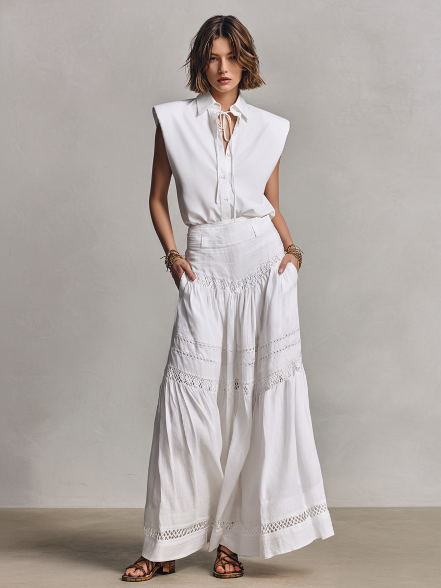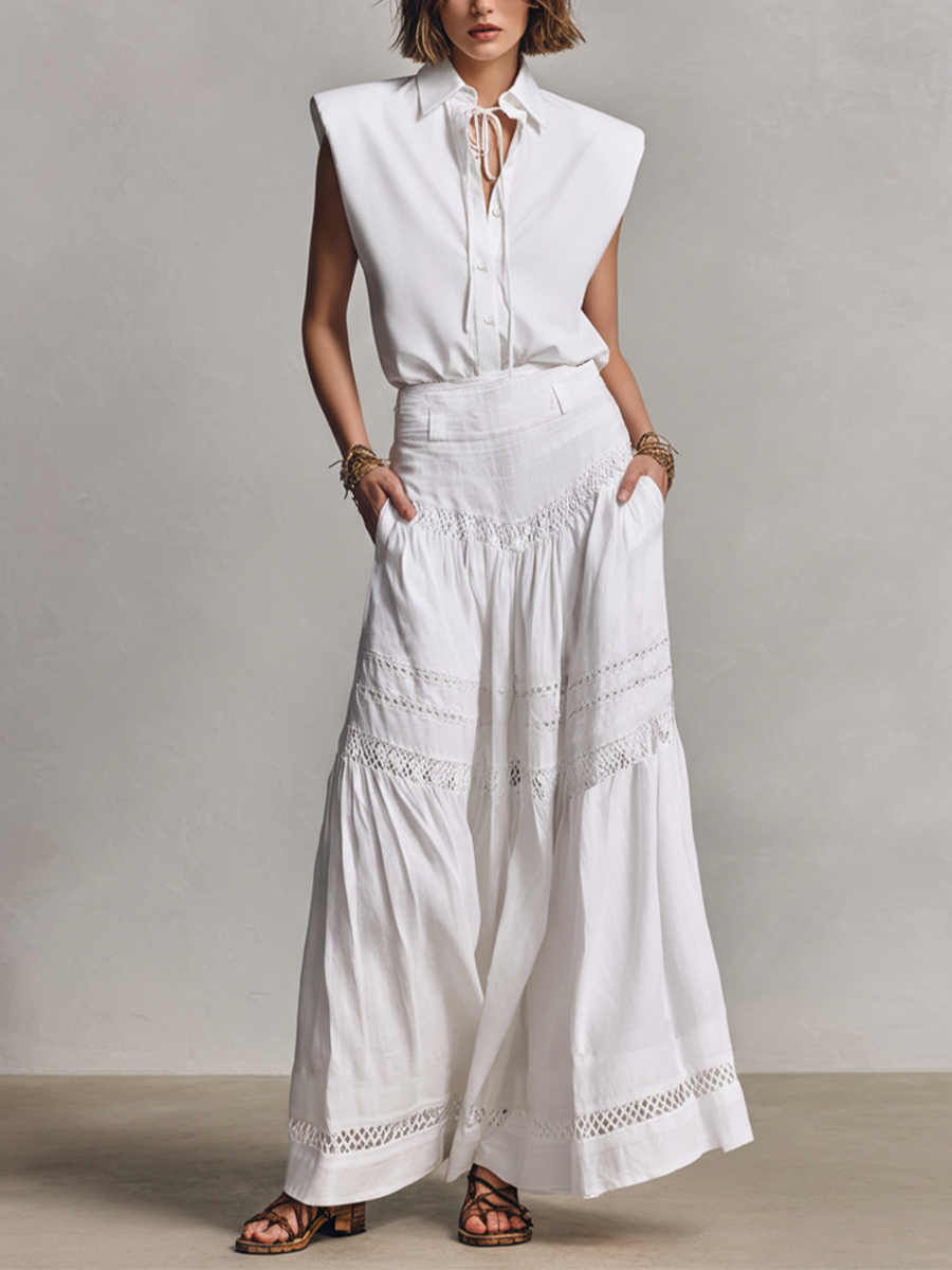 Women's White Cotton Set With Sleeveless Tie-Neck Blouse & Lace-Trim Maxi Skirt, Timeless Boho-Chic Style Set MDZ0307C8I