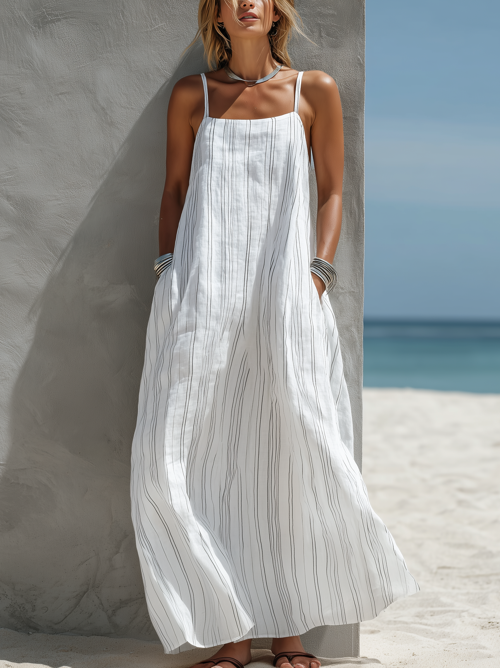 Women's Casual White Vertical Striped Woven Sleeveless Loose Long Dress MDZ0324C9AN