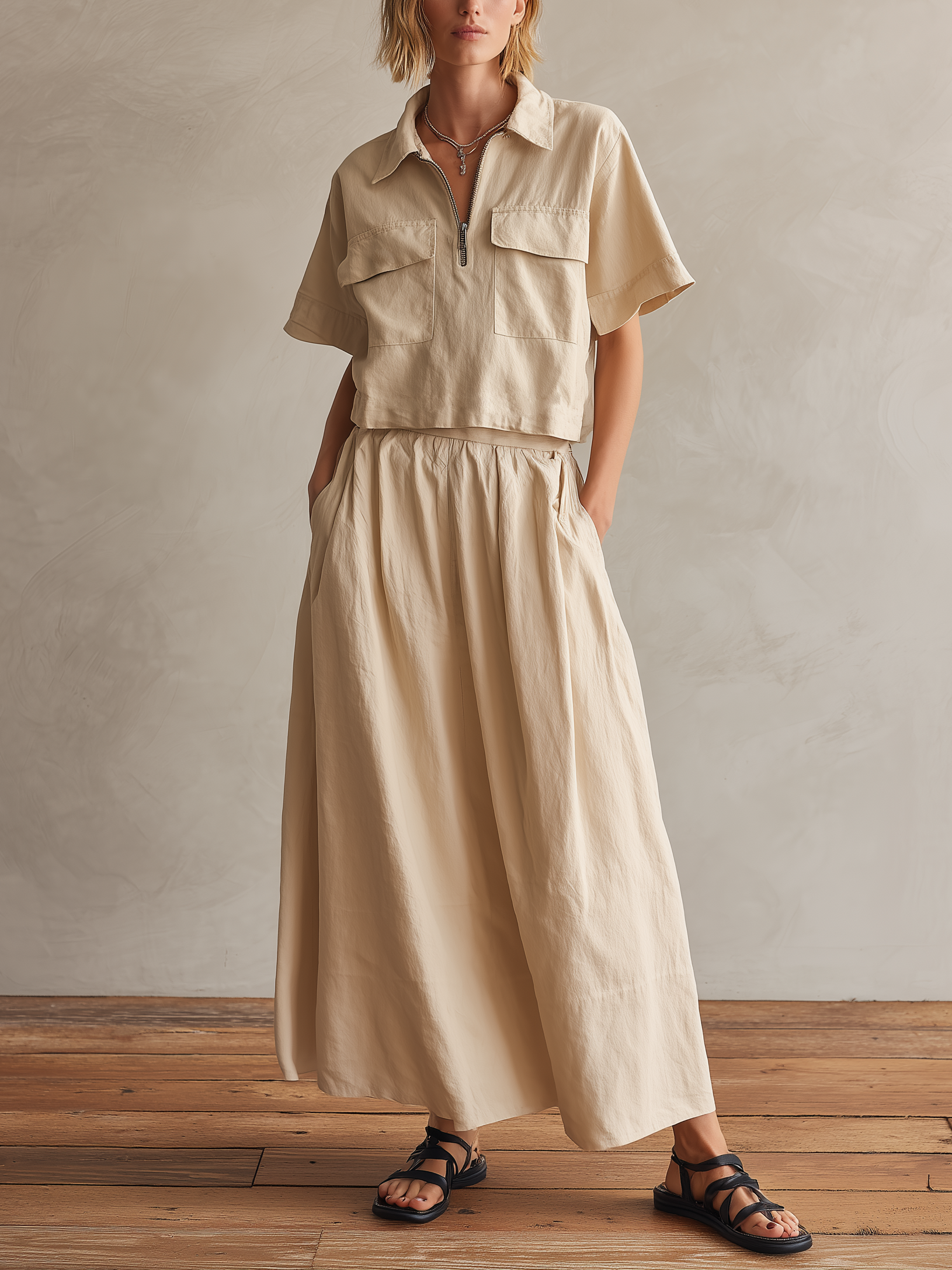 Women's Elegant Beige Woven Shirt Collar Short-sleeved Top Paired With A Skirt Set MDZ0382C5AN