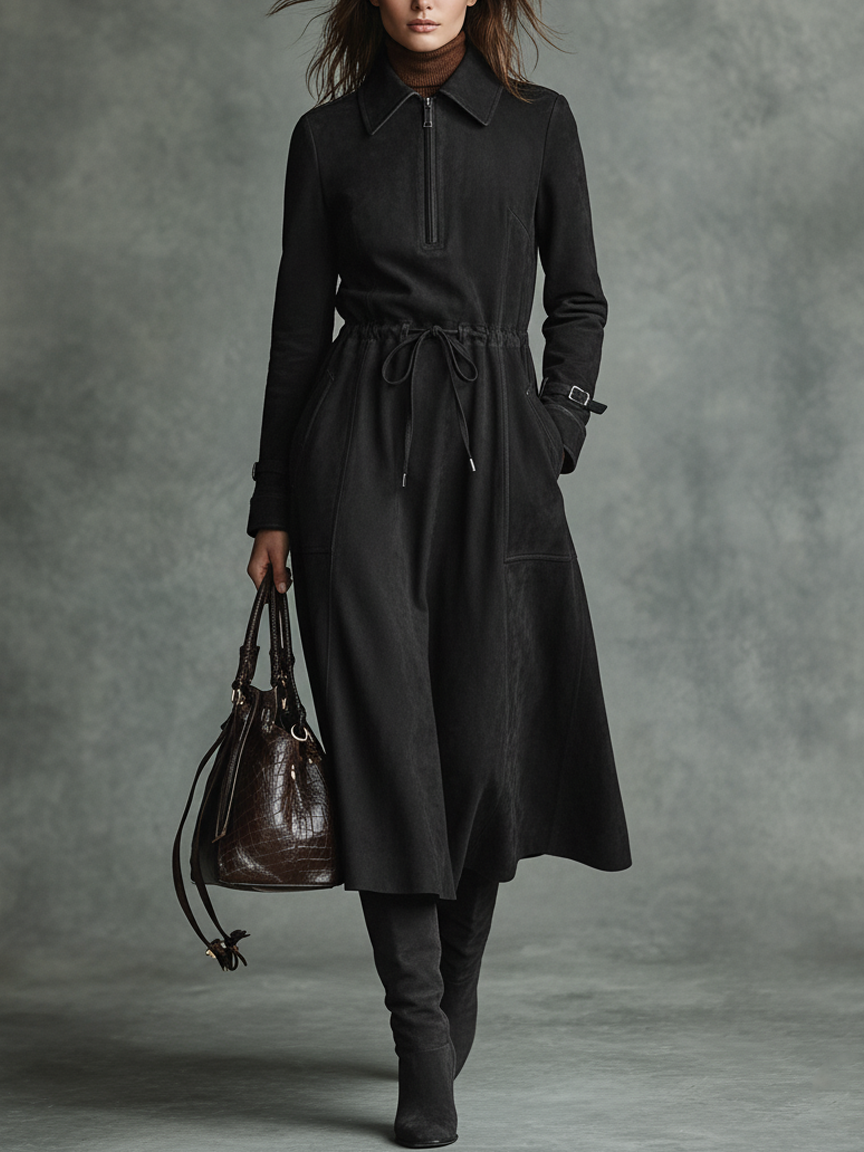 Women's Faux Suede Drawstring Zipper Lapel Midi Dress MDA2802J5Y