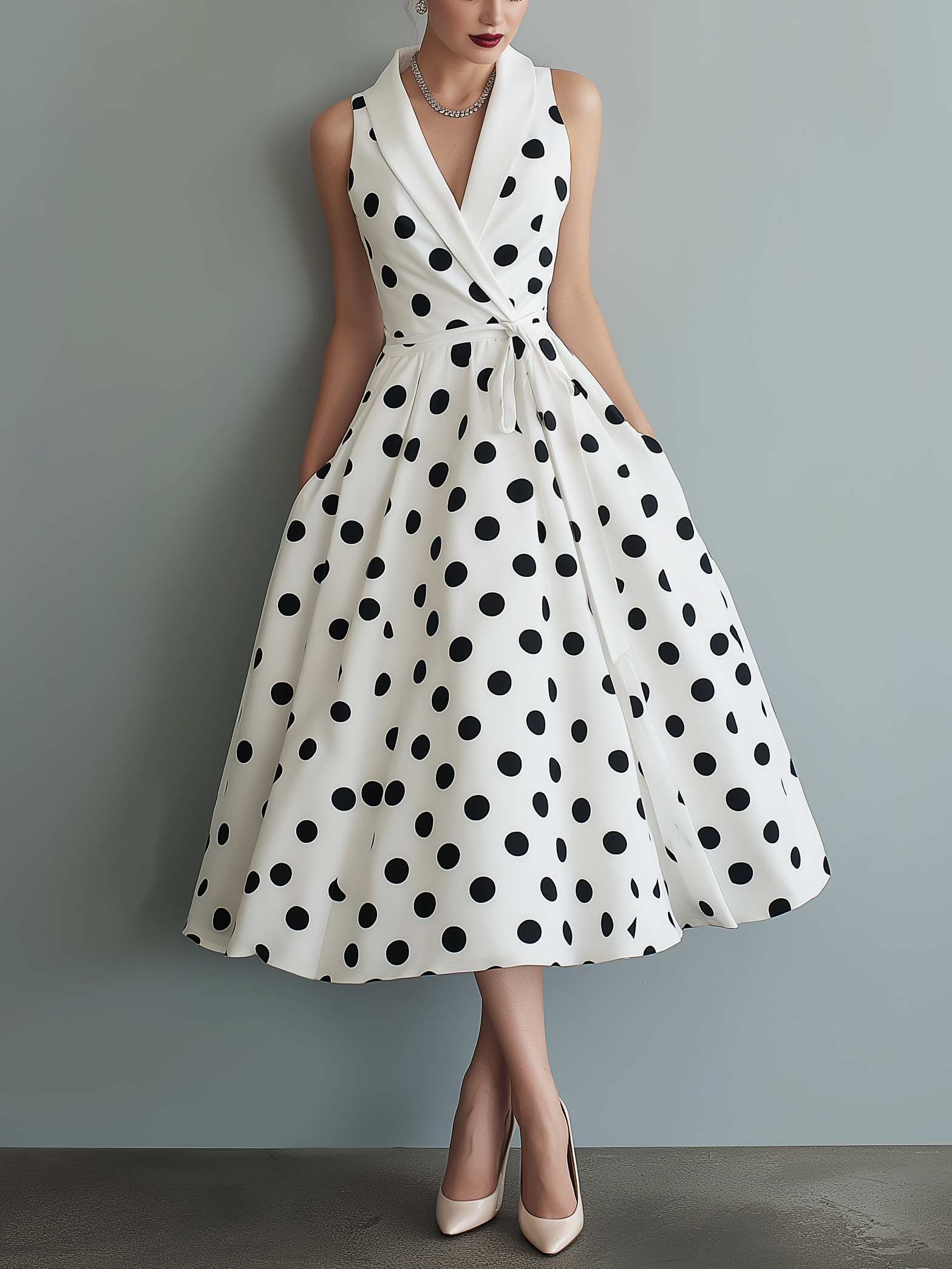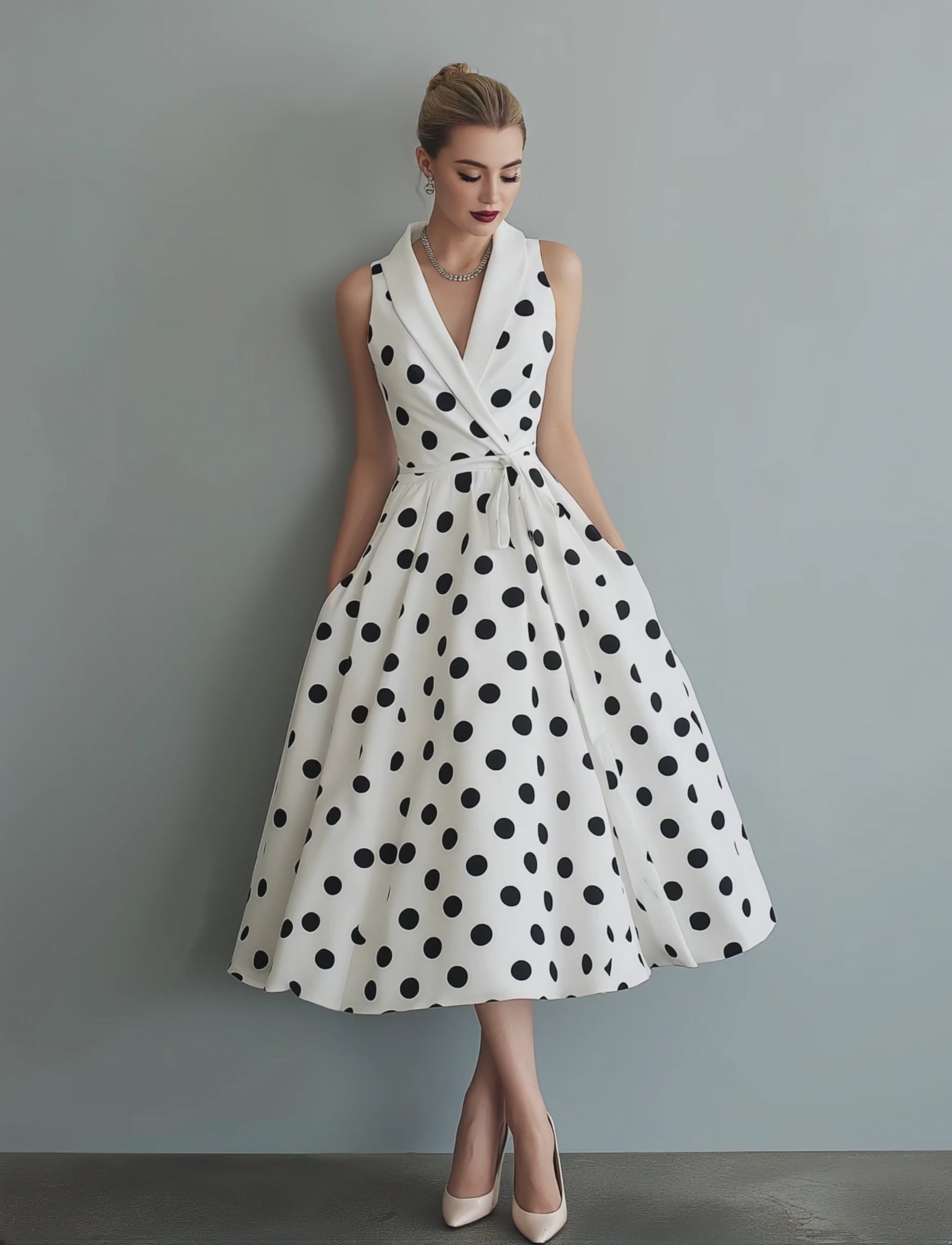 Women's Elegant Black And White Polka Dot Woven Collared Sleeveless Midi Dress MDZ2463B4AN