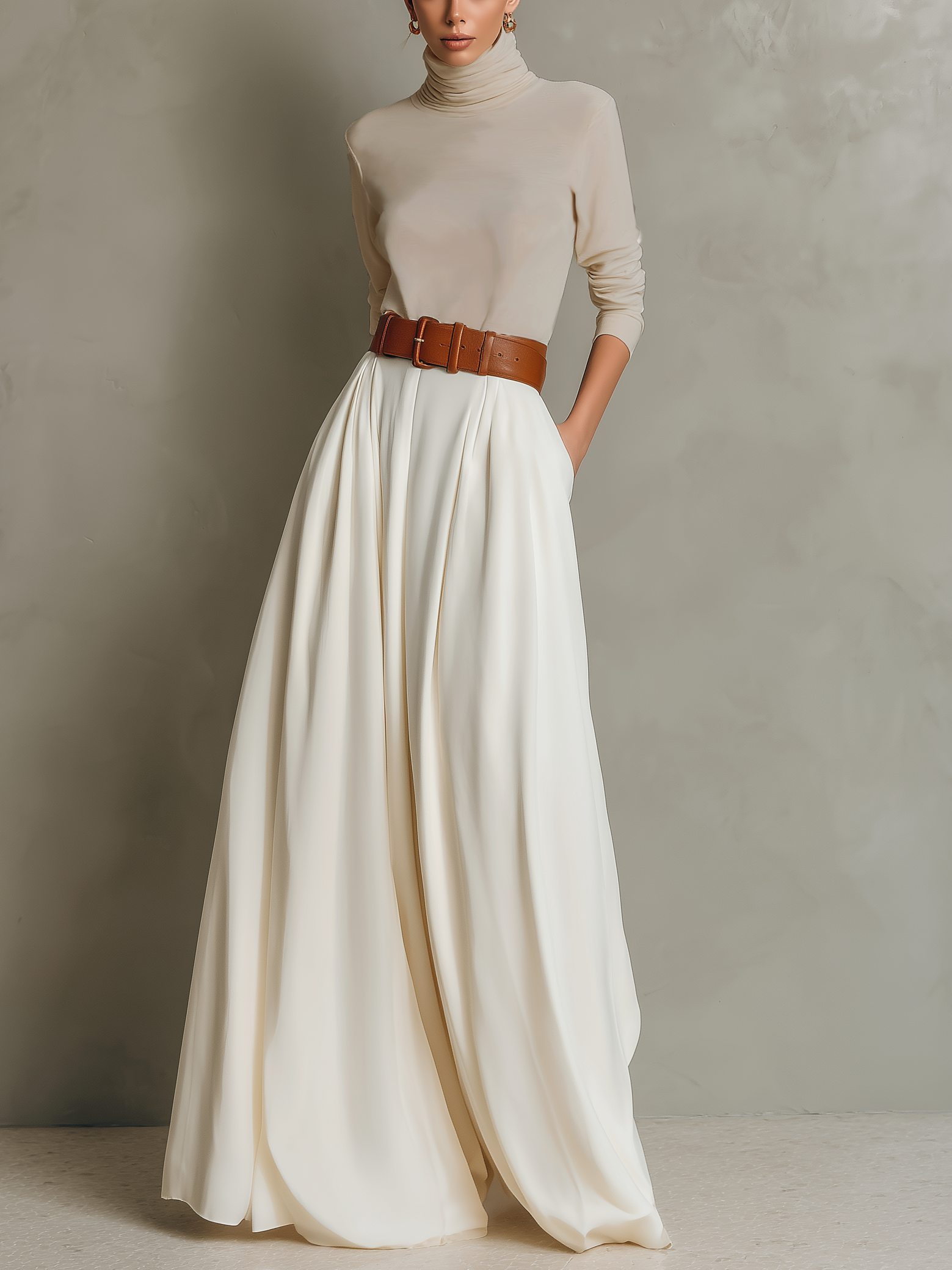 Women's Elegant Apricot Knitted Stretch Turtleneck Long-sleeved Top Paired With A White Skirt (belt Not Included) MDZ0864A0AN
