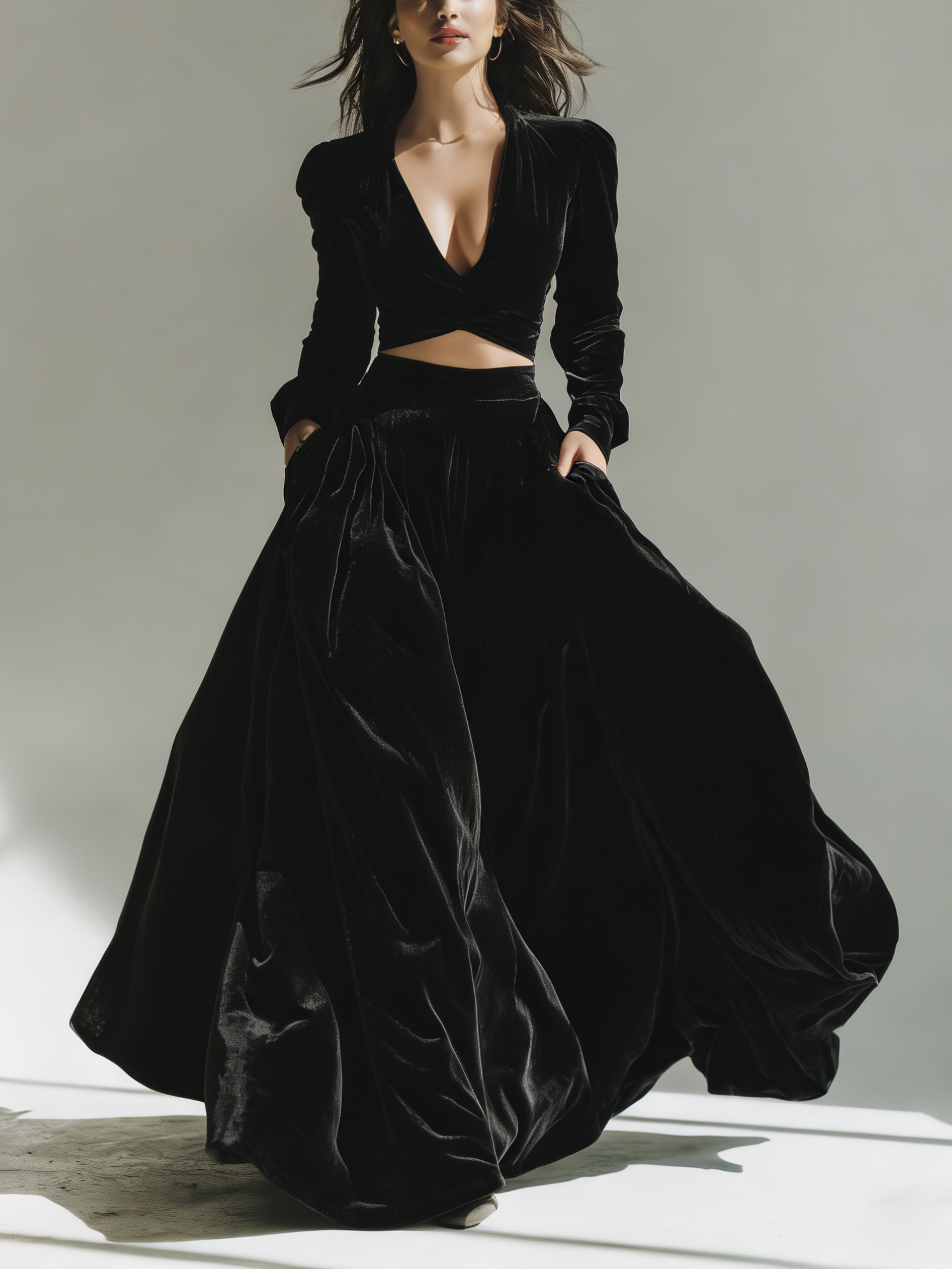 Women's Stylish Black Velvet V-neck Long-sleeved Crop Top Paired With A Long Skirt Set MDZ1309A1AN